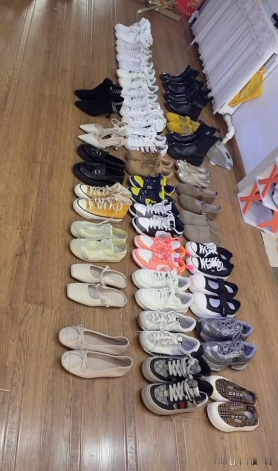 看着这些鞋,你是不是认为这是卖鞋的?事实上,这是一个女人买的鞋,仅仅三年时间,一年平均十多双鞋,丈夫气愤不过,给她一下子摆出来了,就这,还没有全摆出来。你就说,这奇葩不奇葩吧? 我老婆两年没买一双鞋了,我今年想着花150元给她买一双被拒绝了,她说150我可以买2双好的,现在穿的都是旧鞋还有侄女不穿的鞋,家里唯一的包是花55买的地摊货,平常出门都是拿个帆布提兜,也没有人鄙视。 有人说,卡里有钱才是硬道理。那是不错。我有一个亲戚老两口都退休了。月金近2万。可它每天还扒垃圾桶拾破烂。对自己特别扣。身上没有一件象样的衣。三歺也是最最普通的生活。亲戚明友想从它手里借点啥的。它就说你们又是吃不住。生活困难。可对那些特别困难的人三百五百从不吝啬。其中还给一个无父母。靠爷爷奶奶生活的两名小孩上学援着了10万。 只有越没钱才会越爱买鞋显摆,越爱显摆乱花钱的才会日子越过越不好过了,没有规化乱花钱,再好的日子也顶不住折腾。妈呀,我一年就两双鞋,春秋夏一双,冬天一双,穿坏了换。 有男子说,普通家庭中,一个女人的鞋有十双以上的,你就别指望这个女人能持家了。这是铁律!这还算多啊,我家闺女喜欢买鞋,比这还多,太气人了,我看就来气。我家八个鞋柜,放的也全是老婆的鞋,百八十双肯定是有,我也是咬牙切齿的…,母女一个样啊。我就四双,人字拖,皮鞋,休闲鞋,运动鞋。 有些女人不知道男人挣钱多不容易,只知道买买买,包一个就够用了,非要一个接一个买,一个最少几千元,多者上万元,鞋一双接一双买,只顾自己心情畅快,不顾别人感受,这就是典型的顾己不顾家啊。 鞋就不说了,说说衣服。我媳妇除了鞋子一大堆,衣服也是一大推,两个大衣柜被她的塞满了,次卧上下铺的上铺也满了,好多衣服买来就没穿过,吊牌还没撕,包装完好。我说,你不穿的送人后再买新的,这样乱糟糟的,我看着心烦。她怪我买的房子小。唉,遇上这样的人,我真无语了。