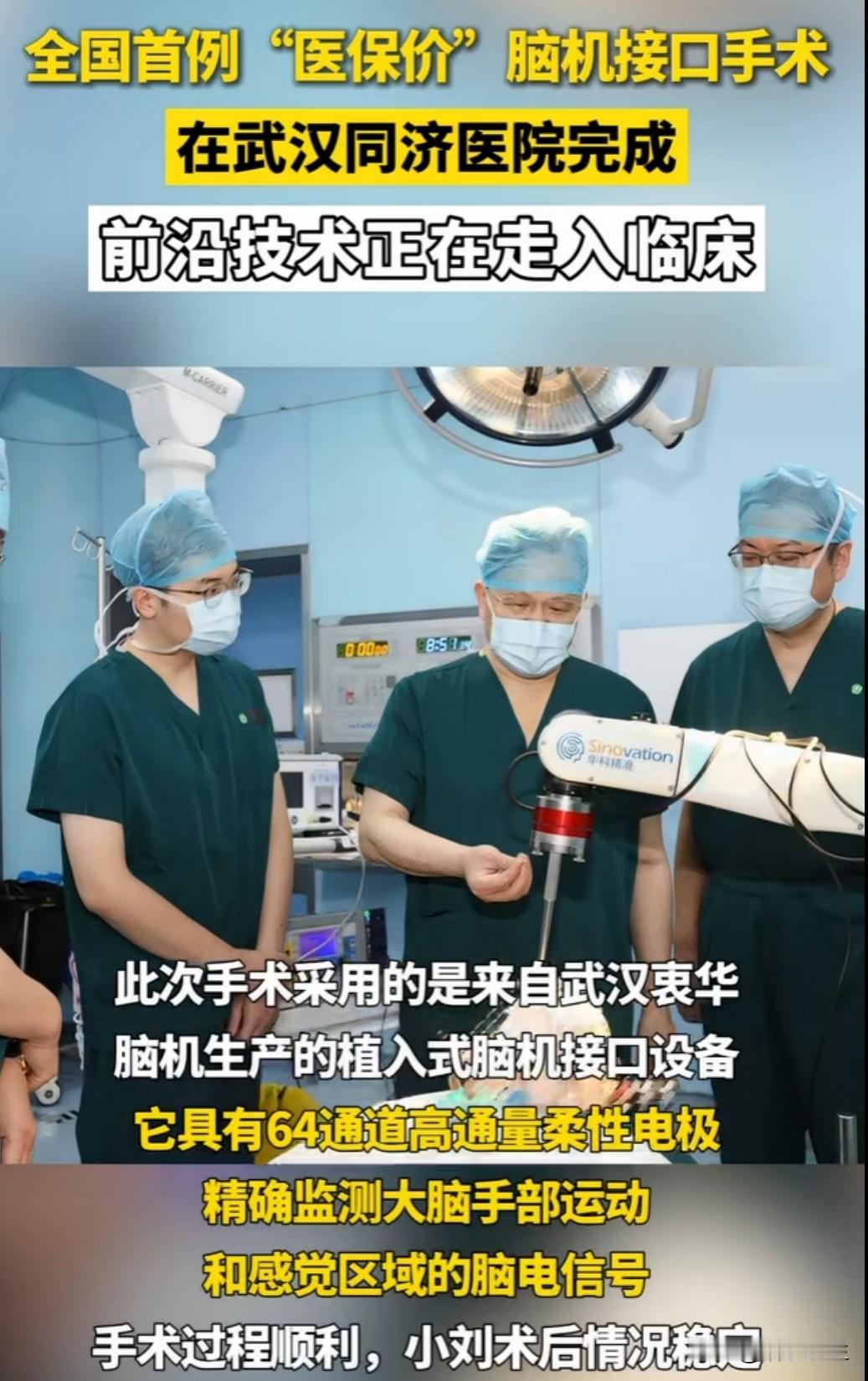 医疗科技重大突破!武汉成功完成全国首例"医保价"脑机接口手术,侵入式脑机接口置入费仅6552元,大大降低了患者负担。 这项技术能帮助瘫痪患者恢复部分行动能力,意义重大。以往类似手术费用高达数十万元,普通家庭难以承受。此次纳入医保,让更多患者看到希望。但也有人担心,低价会不会影响技术质量?专家表示,费用降低得益于技术成熟和医保政策支持,治疗效果不受影响。这标志着我国脑机接口技术进入临床普及阶段,未来有望造福更多神经系统疾病患者。
