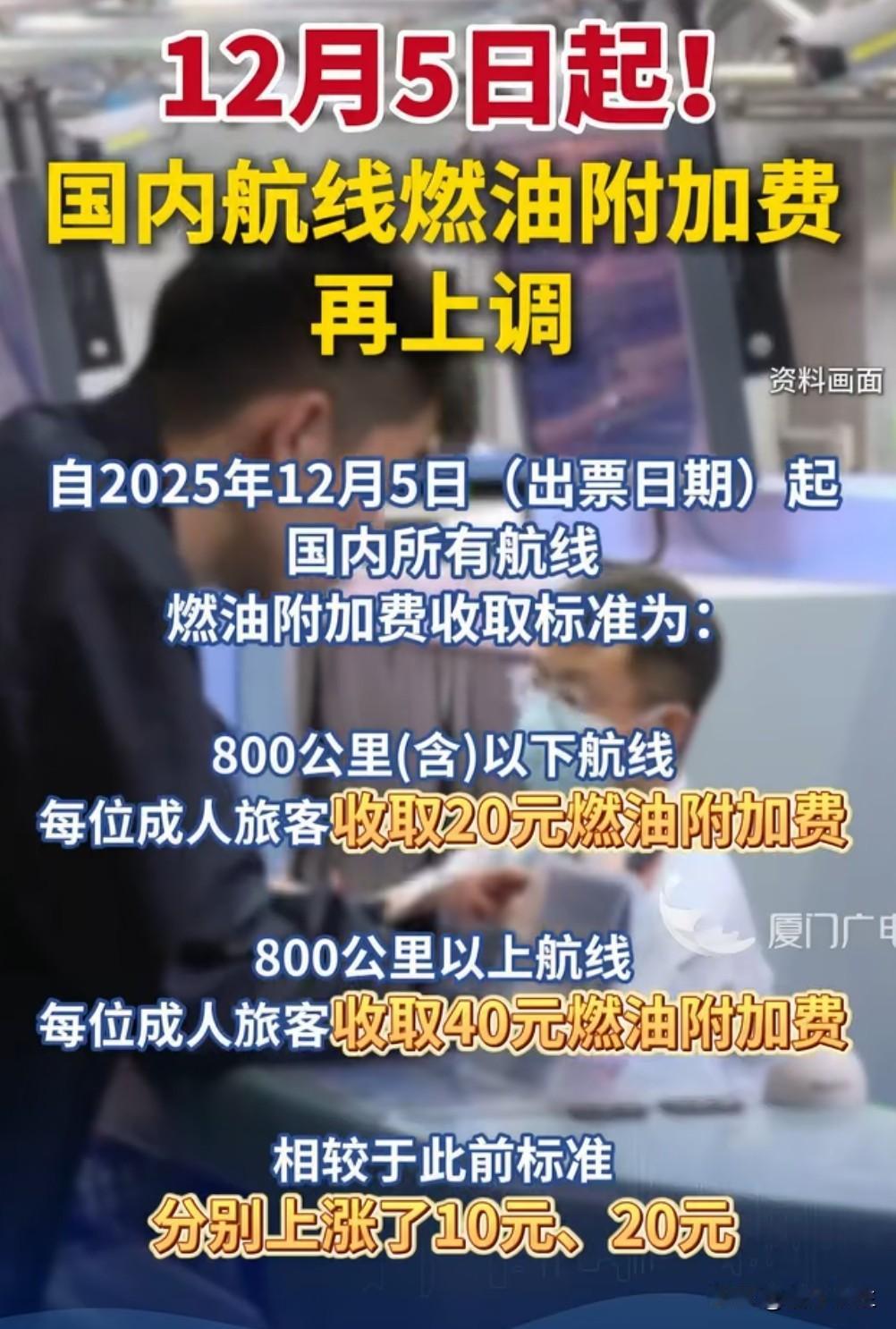12月5日起,国内航线燃油附加费将迎来新一轮上调!800公里及以下航段从原来的10元涨至20元,800公里以上航段从20元涨至40元,涨幅高达100%。这是今年以来的第三次上调,机票价格压力陡增。 此次调价背后是国际油价持续走高,航空公司成本压力加大。但对消费者来说,年底出行成本将明显增加。以上海飞北京为例,往返燃油附加费将从40元涨至80元。业内人士分析,若油价继续上涨,不排除后续还会调价。建议有出行计划的旅客尽早购票,或选择高铁等替代交通方式。