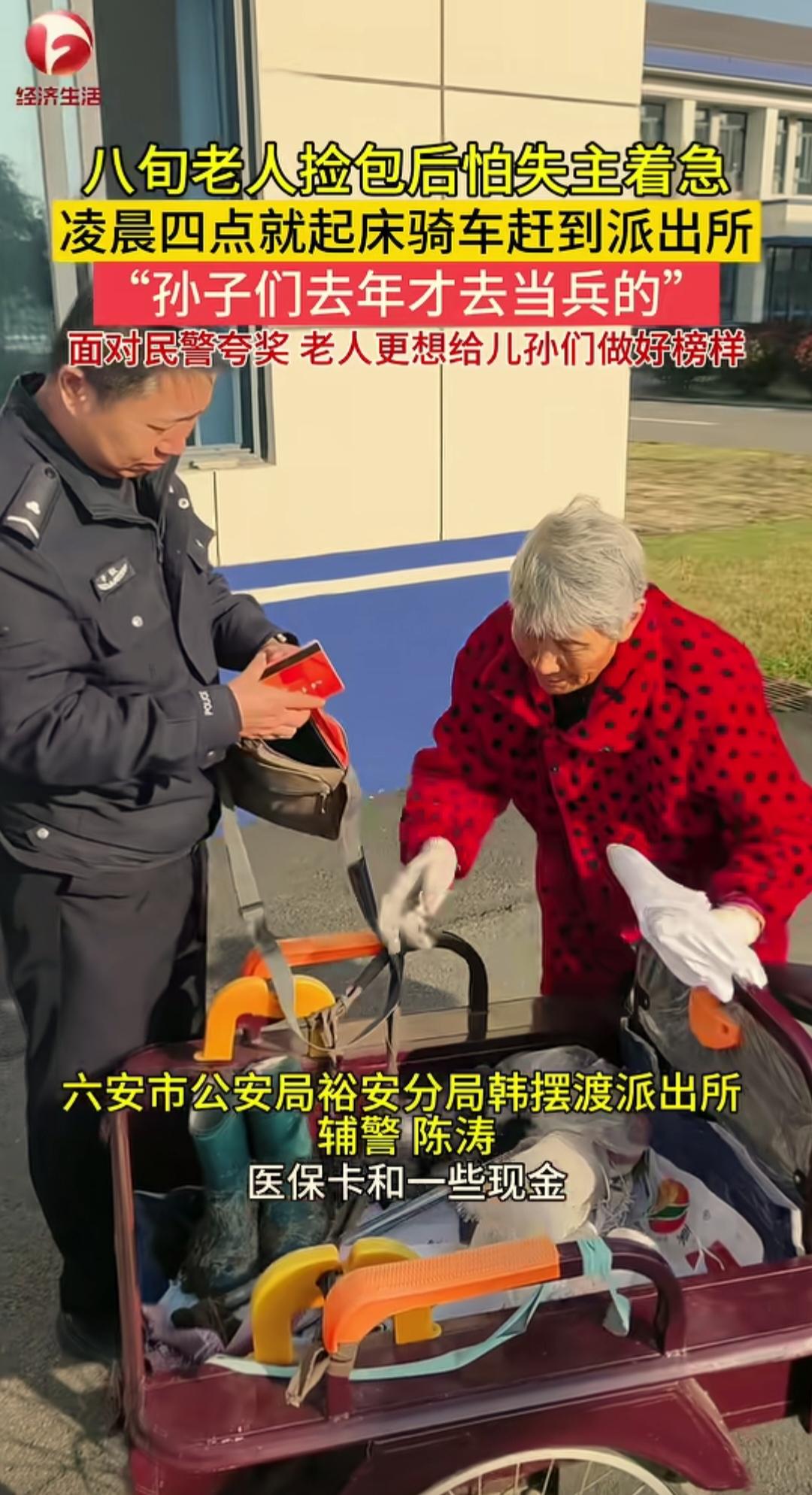 安徽六安,八旬老奶奶在超市门口捡到一个包,里面有现金,银行卡和医保卡。 奶奶看天已黑了,家离派出所又那么远,她骑车不便,就带着包先回家了。 奶奶一晚上都在记挂这件事,怕失主着急,她凌晨四点就起床了,骑着脚蹬三轮车赶到派出所,把包交给了民警。 面对民警的夸奖,奶奶说,孙子们去年才去当兵,她也要给孩子们做好榜样。 家里有这样明事理的老人,受她教育的儿孙们,自然通情达理。 视频中的奶奶虽然满头白发,却很有精神,看起来身体很好。这样明事理的老人才是家中一宝。祝奶奶身体健康,长命百岁。 信息来源:AHTV第一时间
