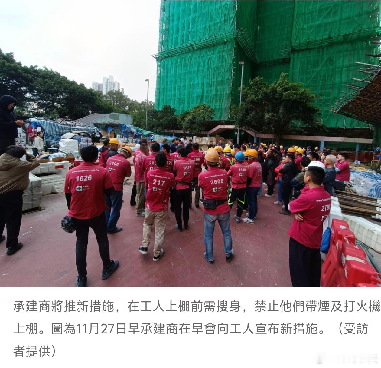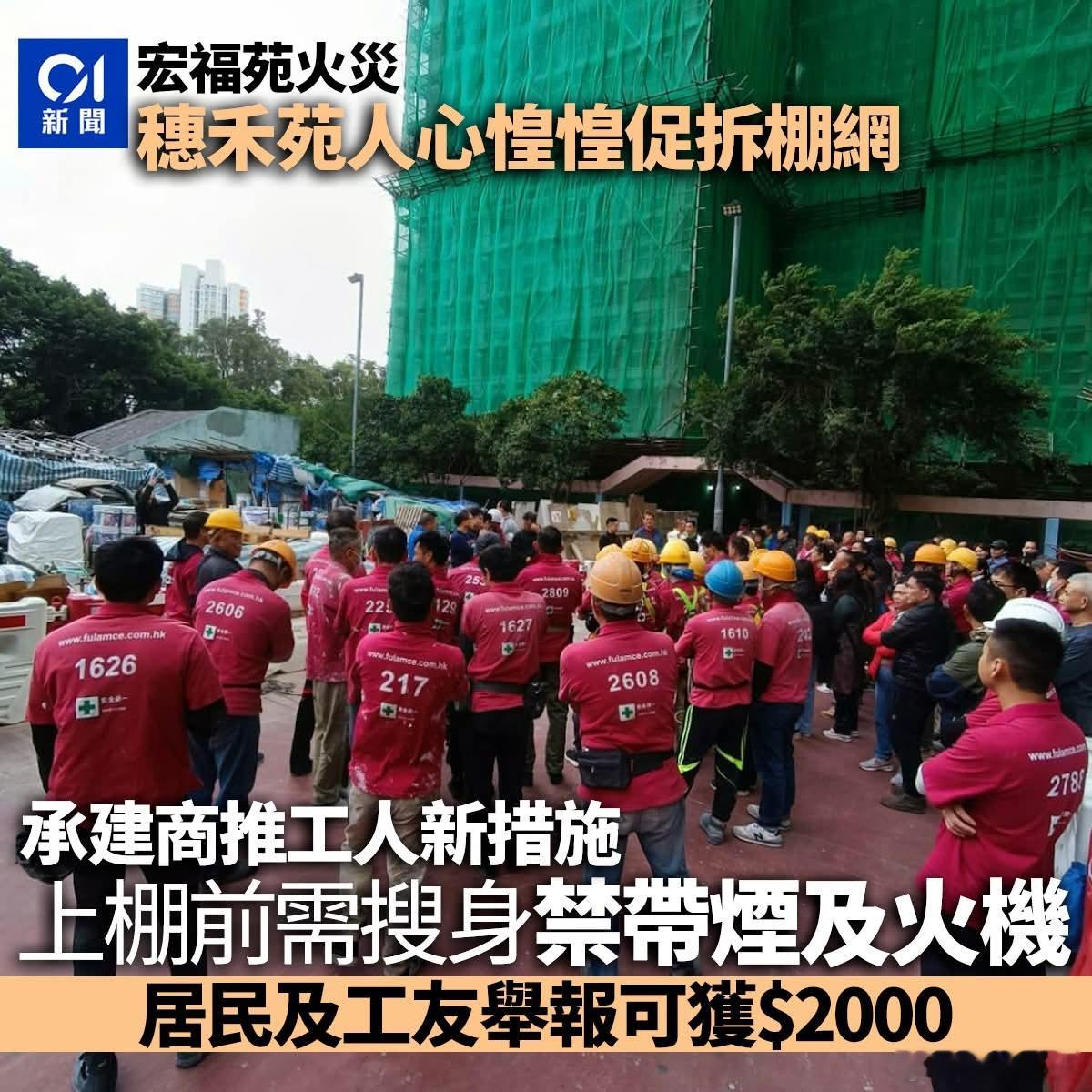 香港居民忧变火灾翻版促拆棚网,禁工人带烟和打火机上棚香港大埔宏福苑火灾伤亡惨重,其他正进行大型维修屋苑的居民人心惶惶,包括位于沙田火炭的老牌屋苑穗禾苑。其业主立案法团主席梁宝玲周五(28日)指,自2023年9月开始的工程原定今年6月完成,现时预计要延误一年。她强调棚网安全,指相关政府部门一直有检验,法团亦有要求承建商「富林工程营造有限公司」拿取瑞士龙头检验公司SGS的证书。她亦指,消防处昨日再到现场剪走棚网样本作检验。不过,有居民称忧心变宏福苑「翻版」,促尽快拆除棚网,「拆光些棚先会安心」。梁宝玲指,承建商将推新措施,在工人上棚前需搜身,禁止他们带烟及打火机上棚;亦会推举报机制,若居民及工友举报工人吸烟并附有照片,即可获2,000元。香港火灾被困菲佣与幼儿已获救香港大埔火灾已致128人遇难
