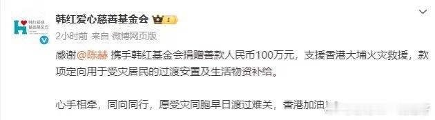 陈赫捐赠100万陈赫捐赠善款100万陈赫通过韩红慈善基金会捐赠100万,专项用于受灾居民过渡安置与生活物资补给,用实际行动为香港加油鼓劲🙏 危难时刻显担当,每一份爱心都在凝聚抗灾暖流,愿灾情早日退去,大家平安顺遂~