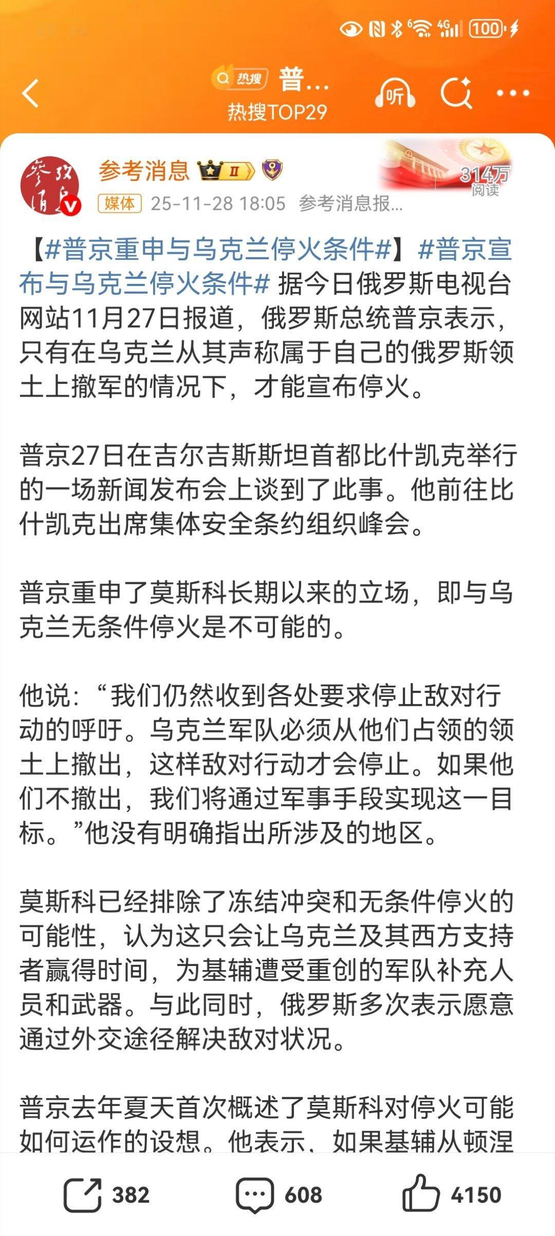 【普京重申与乌克兰停火条件】普京宣布与乌克兰停火条件 俄罗斯总统普京于2025年11月27日在吉尔吉斯斯坦首都比什凯克举行的新闻发布会上,重申了与乌克兰停火的条件。他强调,只有乌克兰军队从顿涅茨克、卢甘斯克、赫尔松和扎波罗热这四个地区撤出,俄罗斯才会停止敌对行动;否则,俄方将继续通过军事手段实现目标。普京排除了冻结冲突或无条件和谈的可能性,认为这会为乌克兰及其西方支持者争取时间。全网热点共创计划普京提出的停火条件,实质上是要求乌克兰单方面割让其国际社会普遍承认的领土,这是一种典型的“丛林法则”逻辑。乌克兰及国际社会不会接受:乌克兰总统办公室顾问已明确强调,不会接受对领土占领的合法化,这是乌方的“红线”。泽连斯基的幕僚长叶尔马克在涉腐辞职前也重申,泽连斯基不会签署任何割让领土的协议。欧洲领导人,如欧盟委员会主席冯德莱恩,也警告反对“瓜分”一个主权国家。这种条件不仅乌克兰人民无法接受,也违背了《联合国宪章》维护主权和领土完整的基本原则。俄罗斯的野心不止于此:接受这样的条件非但无法换来持久和平,反而可能助长进一步的侵略。普京本人曾在2025年6月宣称“整个乌克兰都是我们的”,并称“俄罗斯士兵的脚踏之处便是属于俄罗斯的新领土”,这暴露其最终目标可能远超当前的四个州。若此时妥协,无异于向世界宣告“武力侵吞领土”是可行的,这将破坏全球安全秩序的根基。真正的和平之路:要实现和平,任何谈判都必须建立在尊重乌克兰主权与领土完整的基础上,而非屈服于武力威胁。国际社会需要继续支持乌克兰捍卫自身权利,并通过持续的外交施压,迫使俄罗斯回到国际法框架内解决问题。