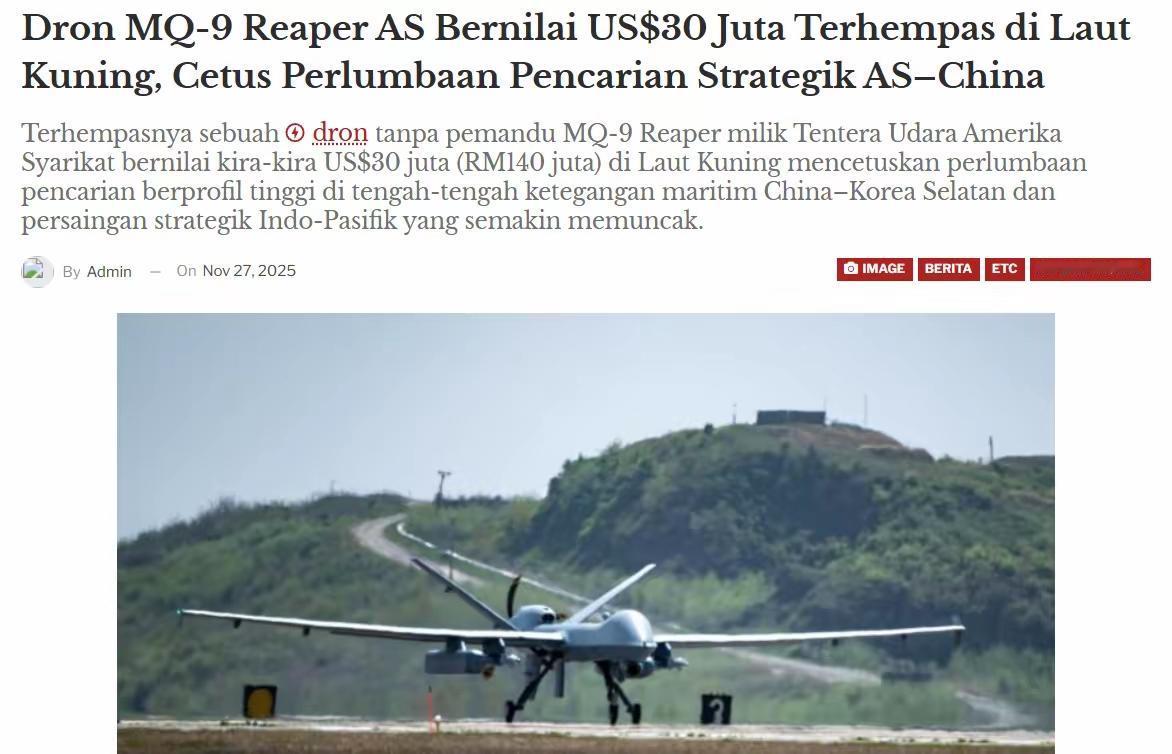 1. 美军MQ-9坠入黄海核心设备未见踪迹 外媒:或被推向中国:美军11月末从韩国群山基地升空的MQ-9无人机,返回时通讯故障失控坠海(距韩西海岸约24千米),核心零部件未打捞到,外媒称若关键设备因潮流被对手获取,美军东亚情报体系将受重创。目前,美军正在争分夺秒地展开打捞行动,多艘专业打捞船日夜兼程赶到事发海域,试图在茫茫大海中寻回关键的核心设备。他们深知这些设备一旦落入他人之手,意味着什么。MQ - 9无人机作为美军先进的察打一体无人机,其搭载的先进侦察设备、通信系统以及数据存储装置等,都包含着大量美军的机密信息和技术。 然而,黄海海域情况复杂,潮流变幻莫测,给打捞工作带来了极大的困难。而且,时间每过去一分,核心设备被潮流推向不可控方向的可能性就增加一分。与此同时,周边国家也在密切关注着这一事件的进展。对于美军而言,这是一场与时间和自然的赛跑。 有军事专家分析,即便美军最终成功打捞起核心设备,这次事件也暴露出了他们在无人机使用和管理上的漏洞。通讯故障能导致如此重要的装备失控坠海,不得不让人对美军的后勤保障和技术可靠性产生质疑。而对于东亚地区的局势来说,这一事件无疑增添了新的变数,未来美军在相关区域的军事行动可能会更加谨慎,以免类似的尴尬情况再次发生。