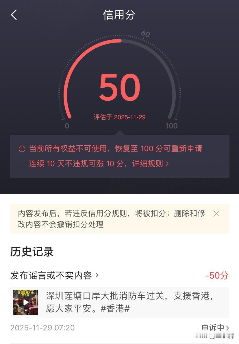 血的教训,账号被扣50分,收益全无! 我的侥幸心理害了自己! 香港大火,我在26日晚看到很多媒体(包括一些权威账号)都在发布“某市驰援”的消息,当时心想这么多渠道都在发,肯定是真的,于是我也跟着发布了相关内容。 结果,今天平台直接判定我散布不实谣言,扣了50分! 账号分数瞬间掉到50分,低于60分的门槛,微头条、文章、视频所有收益全部暂停。更扎心的是,平台规则明确:连续10天无违规才能恢复10分,这意味着至少未来10天我一分钱收益都没有。 更后悔的是,发布后第二天看到质疑声,我竟心存侥幸:“都发完了,应该没事吧…” 正是这个念头,让我没及时删除,最终等来了严厉处罚。 真金白银的教训告诉我: 1. 官方强调的规则,就是绝不能碰的红线; 2. 看到热点务必核实,千万别信“别人发我也能发”; 3. 侥幸心理要不得,必须为自己的账号负责。 而且平台官方课堂反复强调的底线:绝不发布不实信息!课程官方都再三强调不实谣言,会被扣分,影响账号权益,只有被扣分了,才知道官方强调的重要性。 希望大家以我为戒,守护好你的信用分,就是守护你的收入!