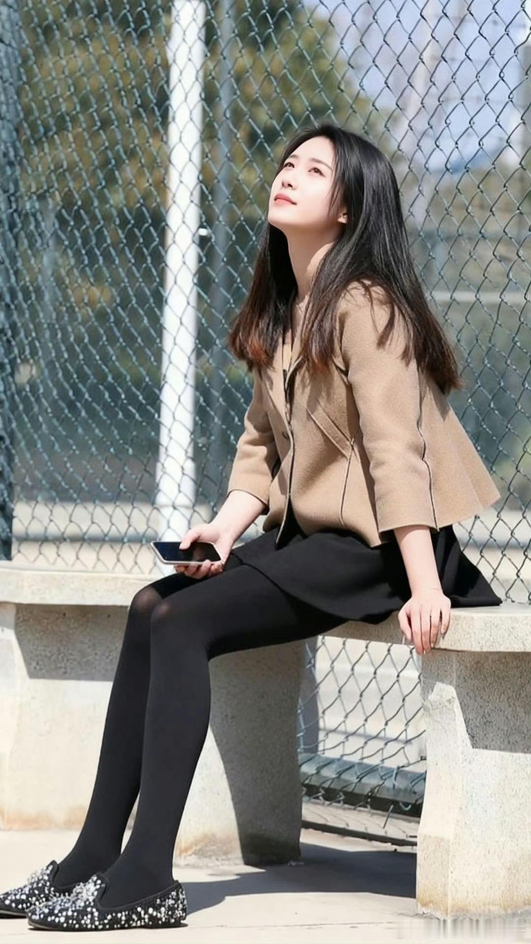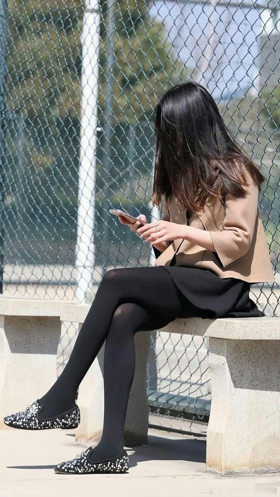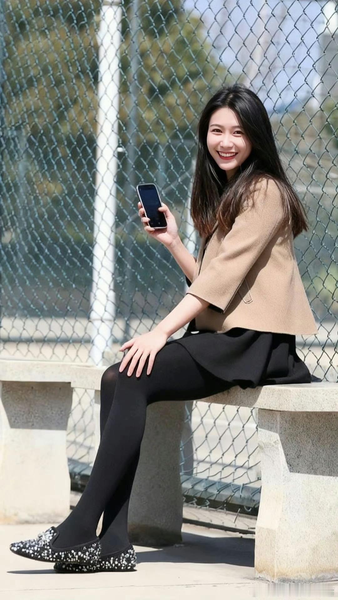 优雅职场风穿搭,黑色丝袜与米色外套完美搭配,手机相伴,静享时光。