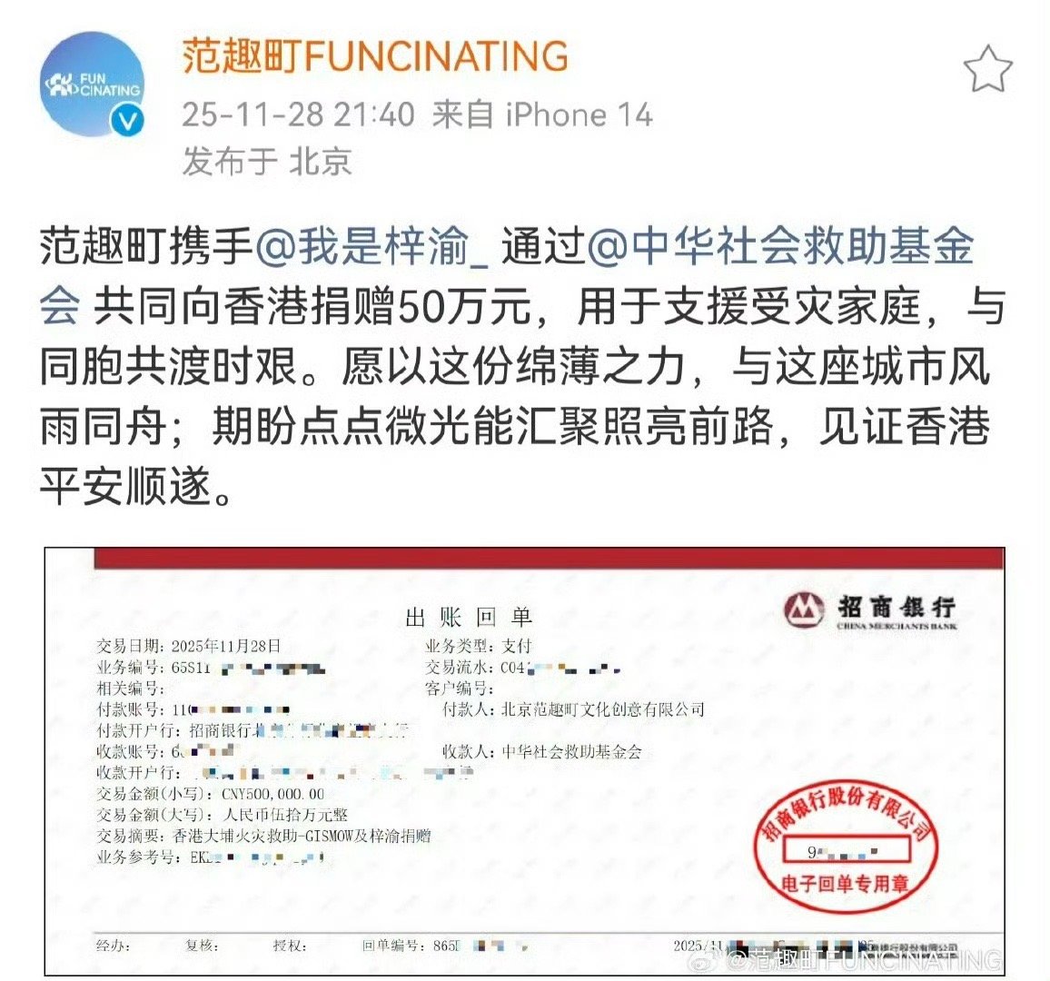 胡彦斌向香港捐款100万胡彦斌捐赠100万元 香港五级火警牵动人心,胡彦斌捐10