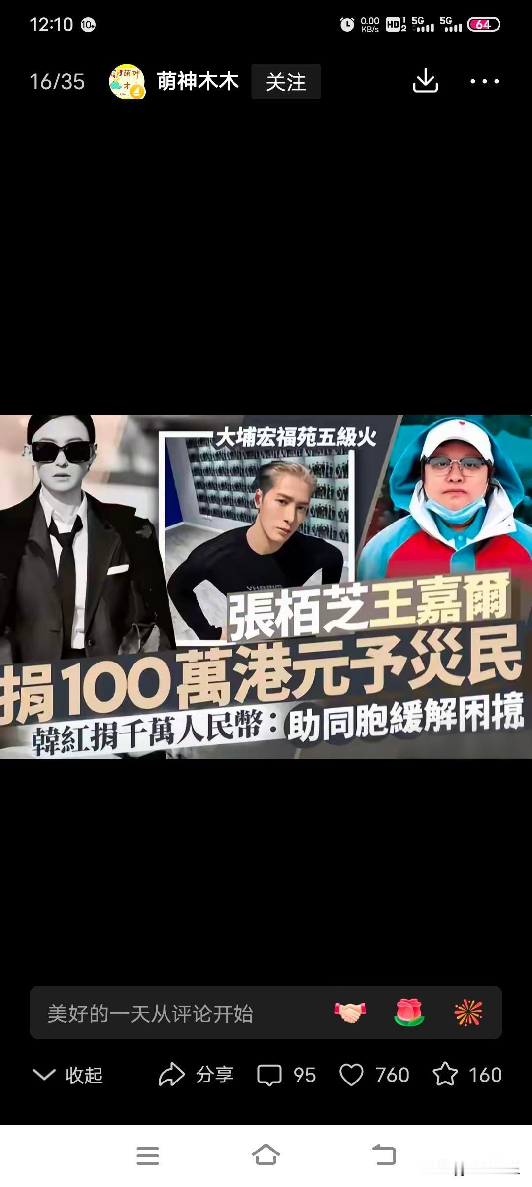 【3800万!娱乐圈用行动证明:灾难面前没有"顶流"之分】 香港大埔火灾牵动着全国人民的心,而娱乐圈这次的集体行动堪称"教科书级"。据不完全统计,近30位明星通过个人或基金会渠道捐款超3800万,其中内地艺人占比超半数,用实际行动诠释了"血浓于水"的同胞情谊。 最让人意外的是谢霆锋与何超琼的"跨界组合"。两人悄悄合作摇滚美食节,以摊位收益名义捐出500万港币,既保留了商人的低调,又展现了公众人物的担当。反观某些韩国公司,一边在MAMA盛典照常狂欢,一边象征性捐款,这种割裂感让网友直呼"对比太扎心"。 夫妻档的集体发力堪称亮点:谢娜张杰、李荣浩杨丞琳各捐百万,陈小春更是特别强调"全家一致决定"。最甜的是何超莲,刚辟谣婚变就以个人名义捐出100万,用行动证明豪门千金的格局。这些"星二代"们没有把捐款当秀场,反而成了传递温暖的纽带。 值得关注的是,许多明星选择匿名捐款。当某基金会更新名单时,网友发现肖战、杨紫、朱一龙等顶流早已默默献出爱心。这种"不声张"的善举,恰恰戳中了当代人对真善美的渴望——毕竟在流量为王的时代,能守住初心的人更值得尊重。 截至发稿,捐款名单还在持续更新。这场没有红毯的公益接力赛,让我们看到:真正的顶流不在热搜榜单,而在关键时刻的挺身而出。正如网友所言:"灾情面前,每个数字背后都是滚烫的爱心。" (话题: