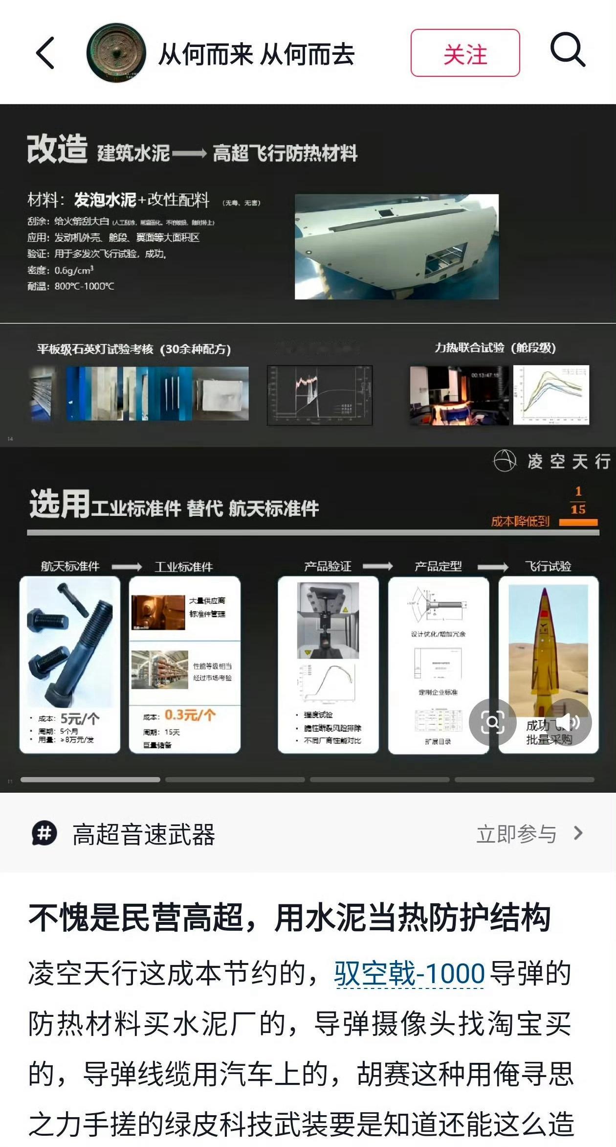 四川民企也能造高超音速导弹,基本型已经实现量产,凭借各种资源整合,“驭空戟-1000”可实现成本降至传统方案的十分之一。r据说防热材料是水泥厂的,摄像头来自某宝购买,电缆是汽车上用的。 所以造价可以低到什么程度,目前猜测70万到120万不等,还不到一辆豪车的价格。官方公布数据很给力,最大射程1300公里,飞行速度7马赫,可以对海上移动平台和各类舰艇实施精准打击。用造远火的成本,打击航母战斗群,性价比高到离谱,还得是中国制造太牛了。另外,像“爱国者-3”这种防空导弹单枚成本打底300万美元,三比一都不一定拦得住“驭空戟-1000”,所以周边美日到底是选择拦还是用头接?[得意]