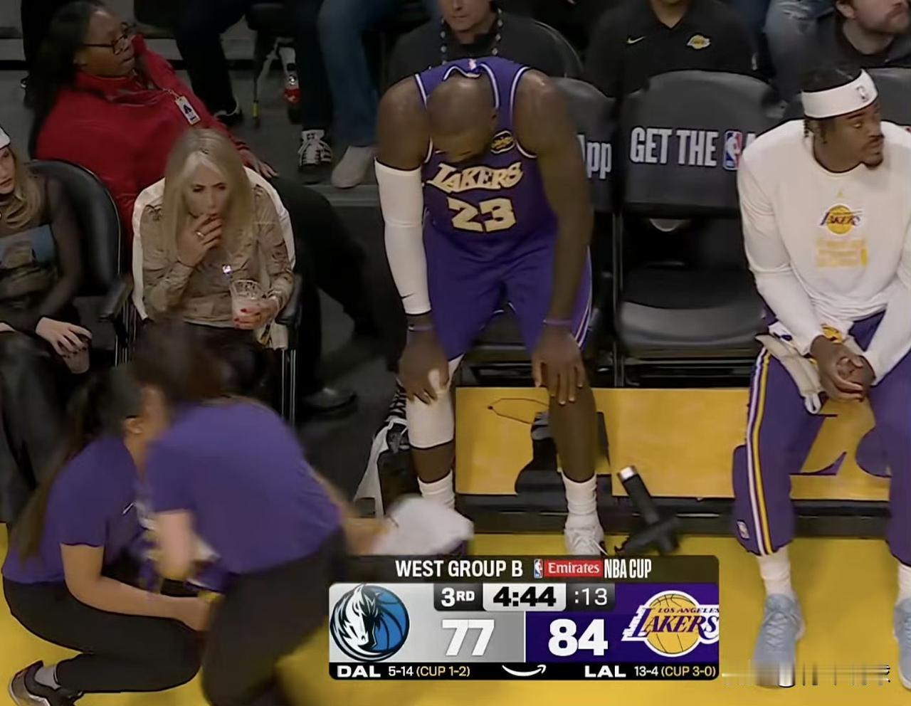 真惨!詹姆斯被欺负了! 第三节4分50秒,詹姆斯在篮下准备上篮时被独行侠队三人合围,最终被PJ-华盛顿钉板大帽拒绝,场面极为狼狈不堪。雷迪克赶紧将詹姆斯换下场休息,回到替补席的詹姆斯双手抚膝,气喘吁吁,看上去非常疲惫。 拳怕少壮。詹姆斯即将年满41岁,虽然依旧能打出非常出色的表现,但在部分回合还是能看到岁月留下的痕迹,人不服老真不行啊!