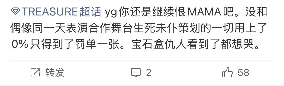 今年MAMA最可怜的应该是TREASURE 宝石盒吧?有合作舞台结果被取消 去现场一个奖没分到 最后喜提交通罚单然后飞回韩国