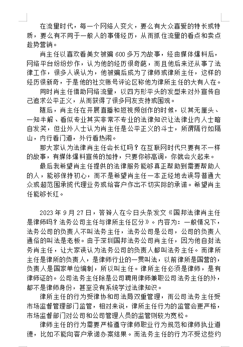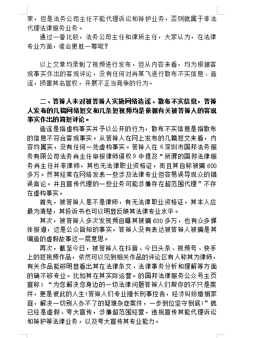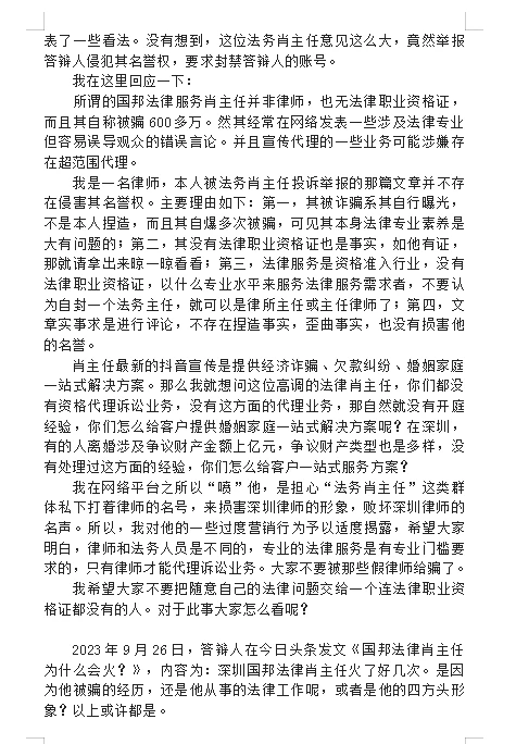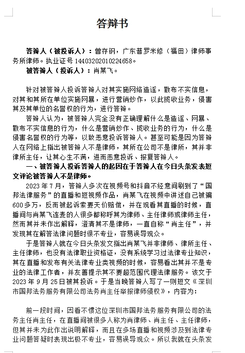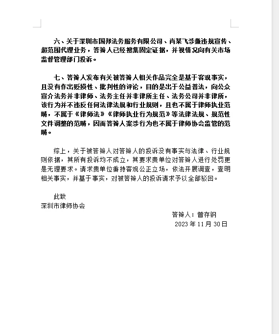 “肖主任”向律协投诉曾律师违规非法招揽业务,对其诽谤,侵害其肖像权等,曾律师不得不向律协作出答辩。
