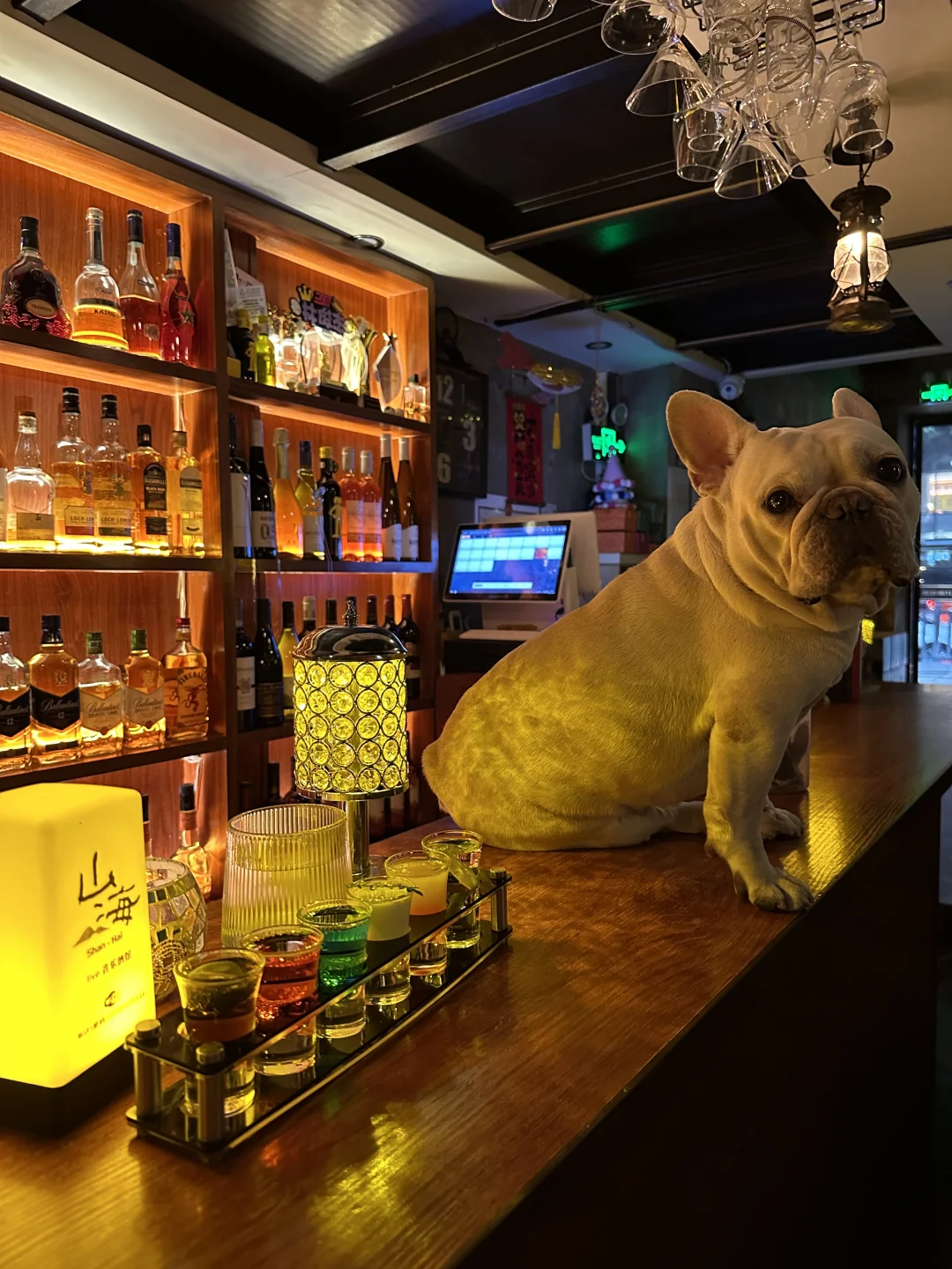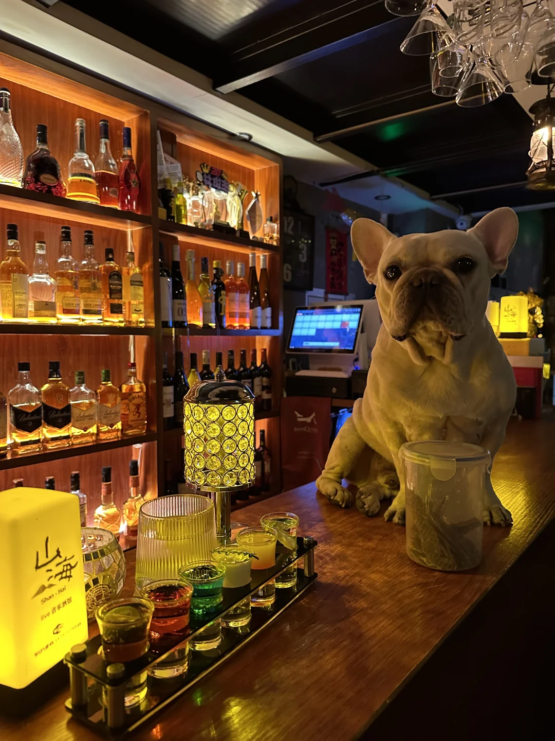 一推门就被熟悉的氛围裹住!老板娘笑着跟我打招呼,网红法斗“法海”立马摇着尾巴冲过来,扒着吧台要贴贴,这小家伙还是老样子,见了漂亮小姐姐就超热情,会主动伸爪子握手,我坐在旁边看着它跟小姐姐互动,还顺手帮她们拍了几张合照,法海全程配合摆pose,简直是店里的“社交牛犊”🐶