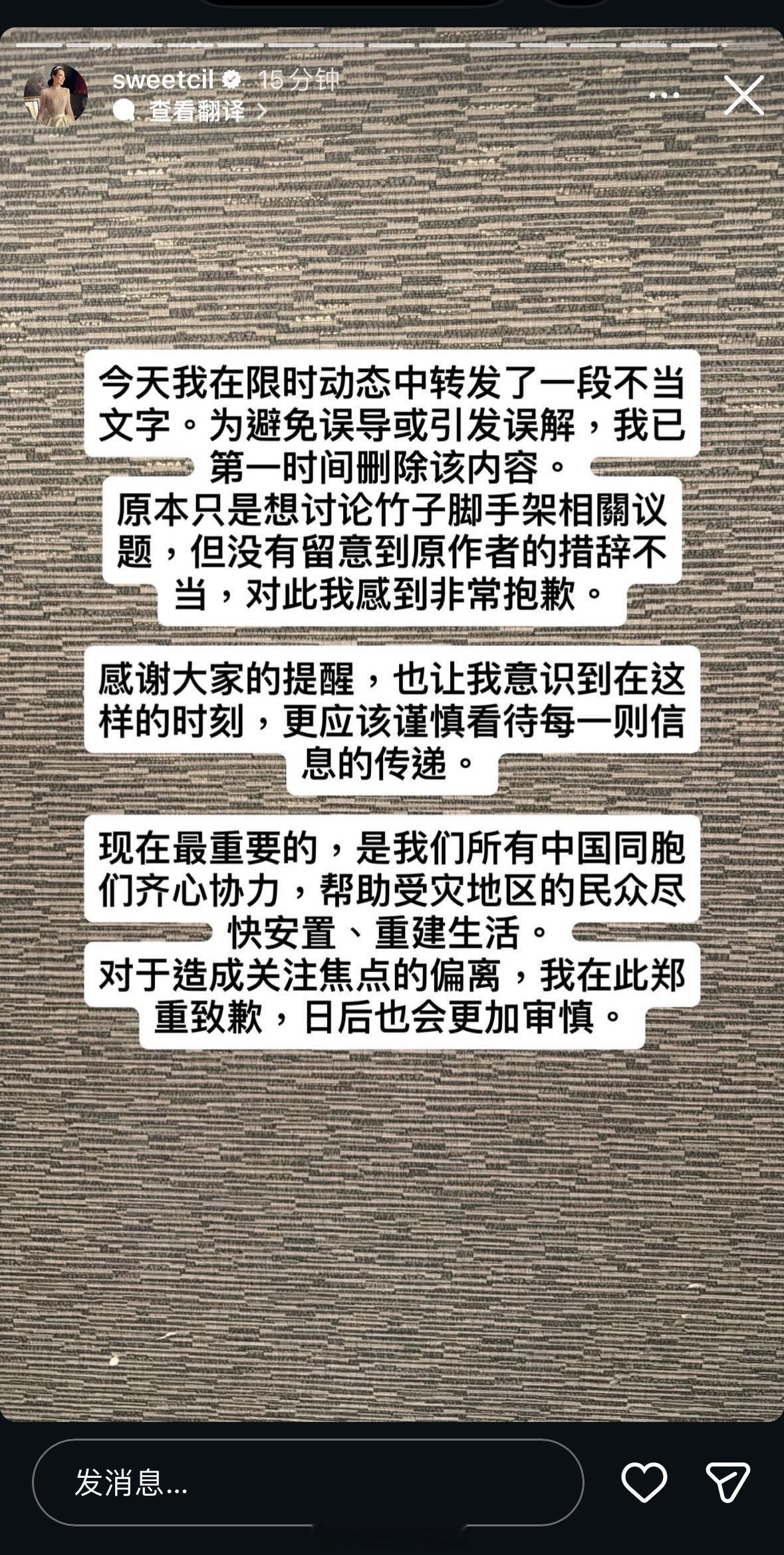 甄子丹老婆ins发文甄子丹老婆发文道歉针对社交媒体误转发的不当内容进行道歉,在微博及ins平台同时公开道歉说明,也希望大众可以将目光转移到灾情上来。今日早间向灾区捐款100万港币,两人一直持续关注灾情,用行动呼吁社会共同关心受灾群众。