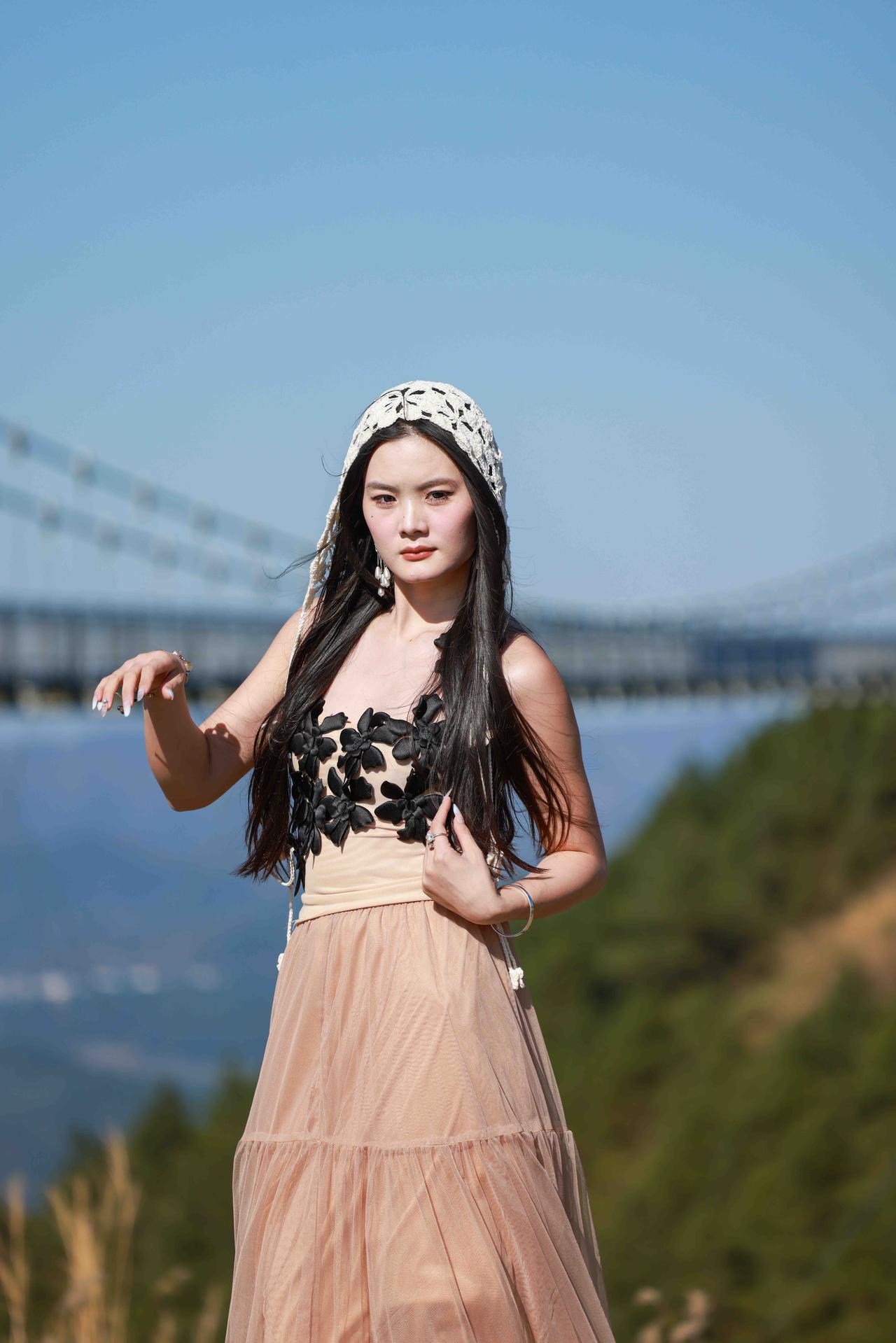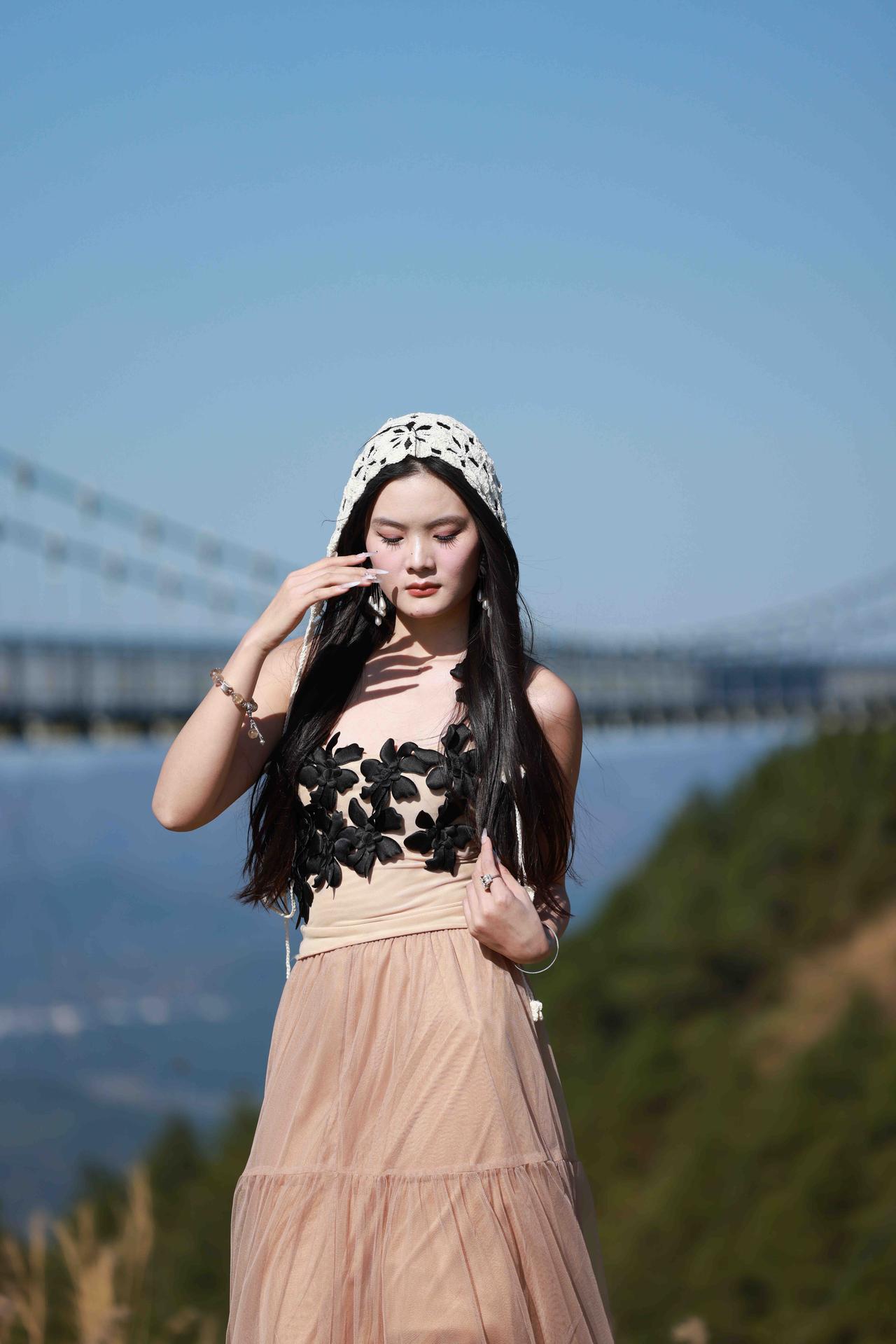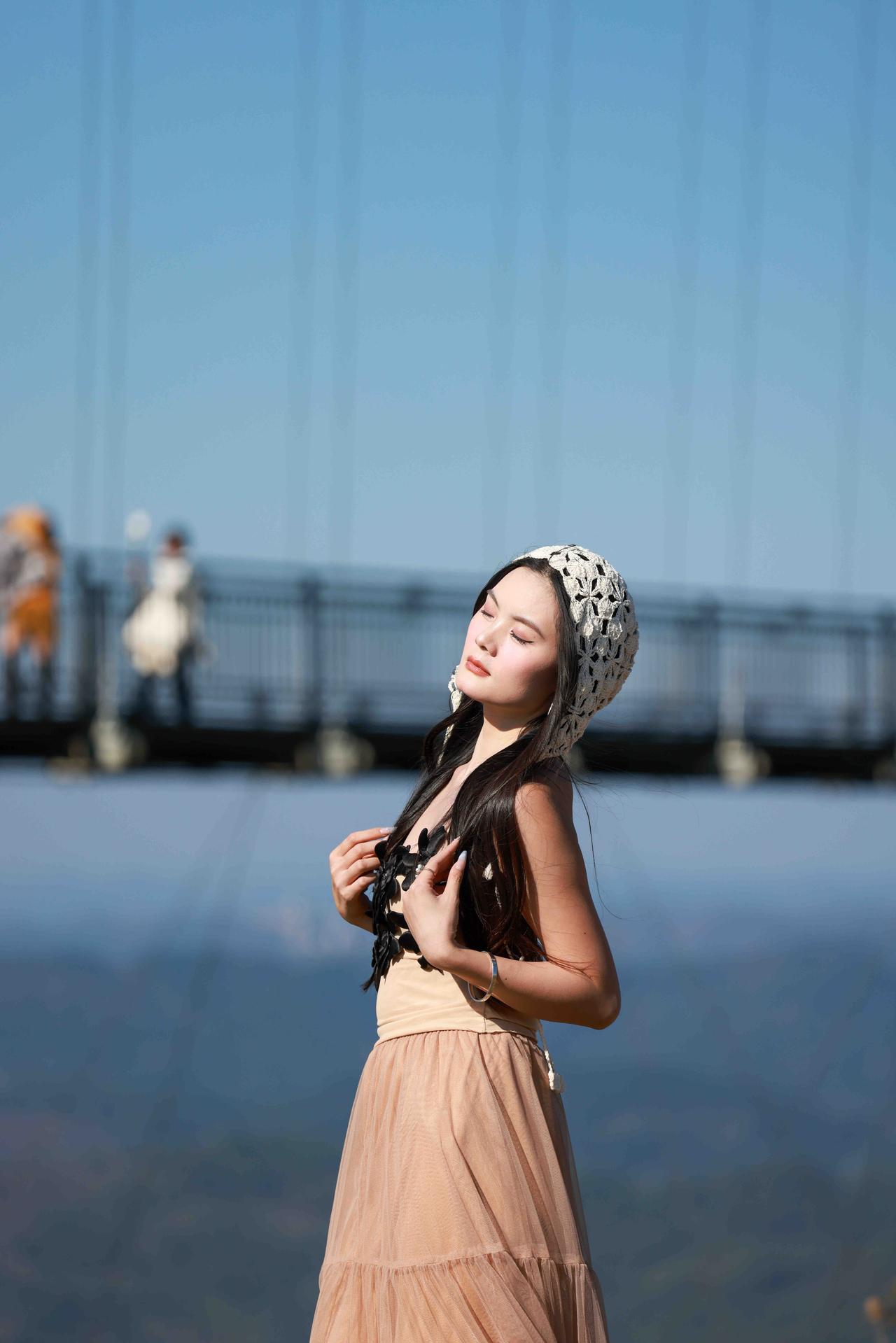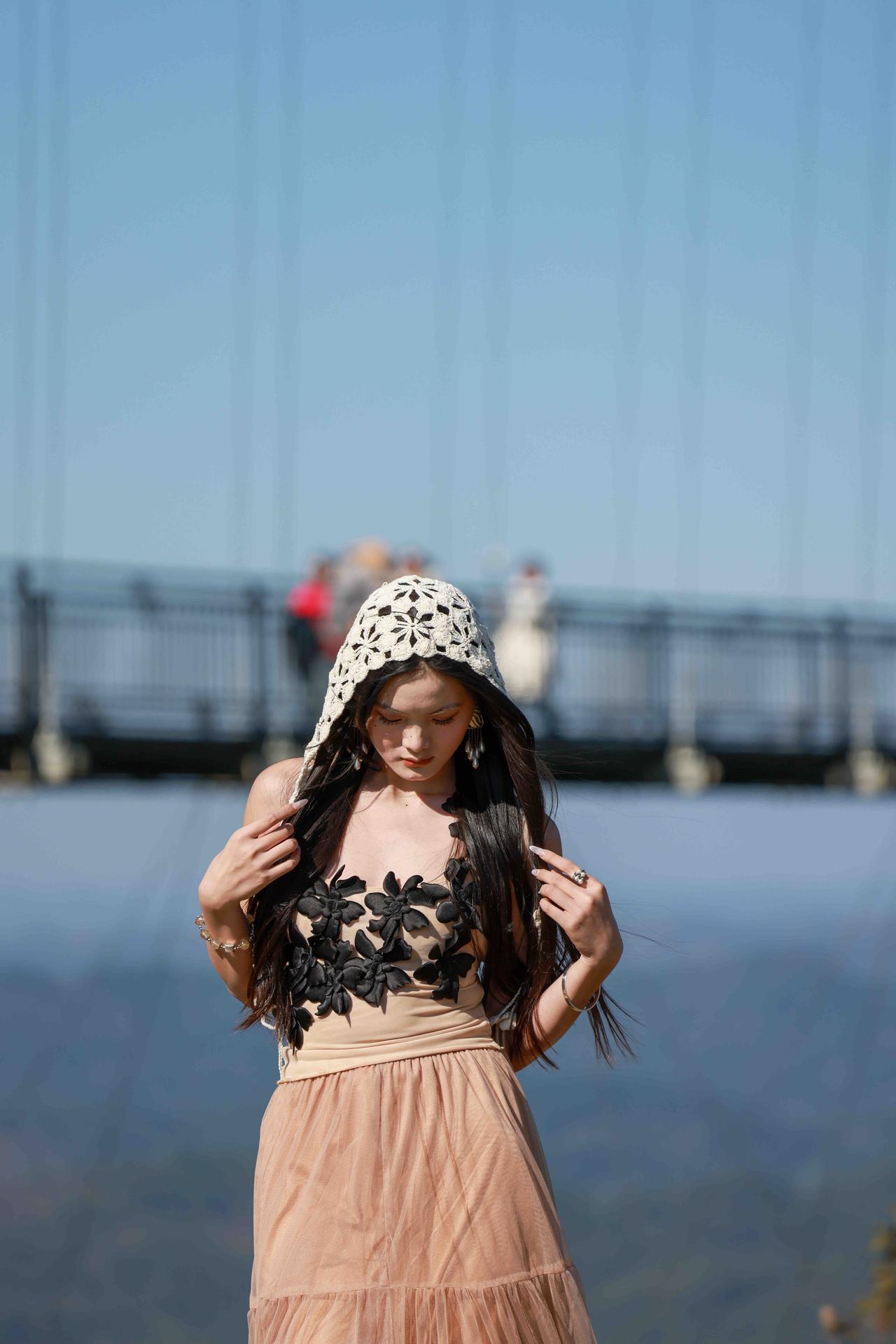 组图|蓝天下的镜头感。 当晴空撞上开阔的高空栈道,风就成了最好的拍照助手。 米杏色纱裙裹着轻柔的雾感,胸前的黑色立体花饰压出精致的分量,钩针蕾丝帽又捎来几分慵懒——这种“柔中带细”的穿搭,刚好和远处模糊的金属栏杆形成温柔与利落的对冲,让画面不单调也不杂乱。 不用逼自己瞪大眼睛盯镜头:垂眸时睫毛的弧度、风掀动长发的碎影,甚至抬手轻拢裙摆的小动作,都是比“看这里”更生动的瞬间。把肢体舒展开,让情绪跟着风松下来,镜头里留住的就不只是造型,还有当下刚好的心情。 拍照从不是“拗造型”的任务,是把风的温度、裙角的轻晃,一起框进画面里的温柔。