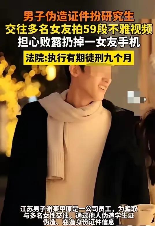 河南濮阳,女子跟男友在宾馆休息时,发现男友手机上有和自己发生关系的视频,正用自己的手机拍照时,男友竟然 将女子的手机抢走扔进酒店旁边的湖内。没有打捞起手机后,女子选择报警。这一报警可了不得,警方在男友的手机里发现59段跟不同女性发生关系的视频。 (来源:红星新闻) 22岁的李女士怎么也想不到,自己通过社交软件认识的“南京某高校00后研究生”,从头到脚全是假的。 对方亮出的身份证、学生证看着煞有介事,温柔体贴的态度更是让她迅速沦陷,9月底刚确定恋爱关系,10月初谢某就专程从南京跑到濮阳见面。 两人住进宾馆浓情蜜意。 可这份甜蜜没维持几天,就被一个意外打破。10月6号晚上,李女士翻谢某背包找充电器。 竟然摸出了两张出生年份差9年的身份证,还有两本不同大学的学生证! 她心里瞬间犯了嘀咕,可谢某还嘴硬说是“学校办的临时证件”,勉强把这事糊弄过去。 直到10月7号凌晨,李女士趁谢某睡着拿他手机看时间,一个微信群消息突然弹出,点进去全是露骨到让人不适的聊天记。 往下翻更是晴天霹雳,自己喝多后被偷拍的不雅视频赫然在列,而手机里竟然存着足足59段类似的视频,每一段的女主角都不同! 李女士脑子“嗡”的一声,赶紧拿自己手机拍证据,结果刚拍了几秒就被谢某惊醒。 他像疯了一样抢过两部手机,死死攥着李女士的手机不肯松手。 凌晨3点,李女士借别人的手机打自己电话,已经提示无法接通。 直到第二天中午,谢某才发微信告知,手机被他扔进了酒店旁边的湖里,就算找了打捞队也没能捞上来。 想到谢某之前的种种可疑之处,李女士又气又怕,再也不敢抱有幻想,果断选择了报警。 警方一调查,渣男的真面目彻底暴露! 所谓的“00后研究生”,其实是1992年出生的江苏淮安人,之前只是普通公司员工,为了骗女生专门花几千块伪造了全套证件。 他用同样的套路交往了多名女性,每次发生关系后都偷偷偷拍,还把这些视频发到群里向同伙炫耀,手机里的59段视频就是铁证如山。 最终法院判决谢某犯故意毁坏财物罪、伪造身份证件罪等,数罪并罚判处有期徒刑9个月,罚款5000元,家属也赔偿了李女士6000元的手机损失。 可说实话,这样的惩罚真的能弥补受害者的伤害吗? 59段视频背后,是59个被欺骗、被侵犯隐私的女性,她们的信任被践踏,尊严被无视,心里的创伤可能一辈子都难以愈合。 更可怕的是,谢某的骗局之所以能屡屡得手,恰恰抓住了很多女生对“高学历、单纯人设”的好感,忽略了恋爱中最基本的警惕心。 这事儿绝不是个例,现在网上交友套路太多,那些把自己包装得完美无缺的人,背后可能藏着你想象不到的阴暗。 别光听对方嘴上说得天花乱坠,学历、工作这些信息,但凡能核实的一定要多留个心眼,比如问问校友、核实工作单位,一旦对方刻意回避,大概率有问题。 更要记住,真正喜欢你的人,绝不会强迫你拍私密照片或视频,但凡有这种要求,直接拉黑止损! 遇到类似的侵犯隐私事件,也别像李女士一开始那样慌了神,第一时间保护好自己,冷静取证,哪怕证据被销毁,也一定要及时报警,让法律给坏人应有的惩罚。 感情里最珍贵的是真诚,可我们不能用自己的真心去赌对方的人品,必要的警惕心从来都不是小题大做,而是保护自己的盾牌。 你身边有人遇到过网恋骗局吗? 对于网上交友,你还有哪些实用的防坑技巧?