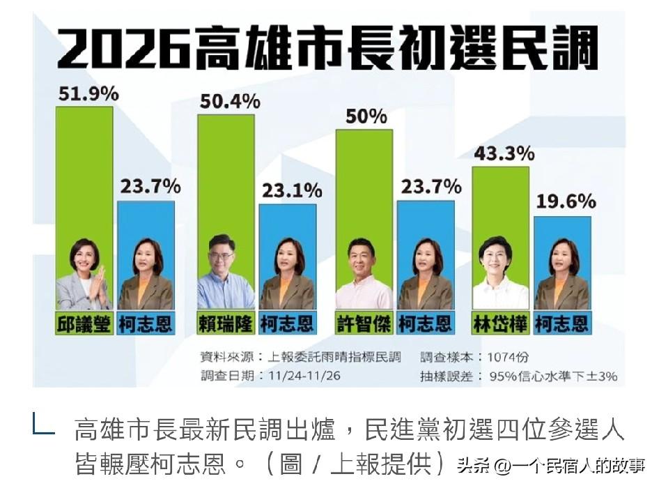 高雄市长民调出炉 国民党柯志恩惨垫底 今天台湾媒体《上报》公布2026年高雄市长选举民调,民进党四位潜在候选人赖瑞隆、邱议莹、许智杰、林岱桦的支持度都领先国民党候选人柯志恩两倍多。虽然这份民调是绿媒的,主要目的是为了打压林岱桦,助力新潮流的赖瑞隆和邱议莹。但反映了一个一贯趋势,柯志恩在高雄民调基本一直垫底,扶不起来。 这位蓝皮绿骨的国民党人,黑起大陆比民进党还狠,像美国、日本、菲律宾在大陆周边惹事,大陆反击,她永远在怪大陆为什么强硬,为什么不让一步!她还说台湾教科书没有“去中化”,奇葩言论比绿营政客还多。 就是她立场这么舔绿,高雄绿营民众也不会支持她。