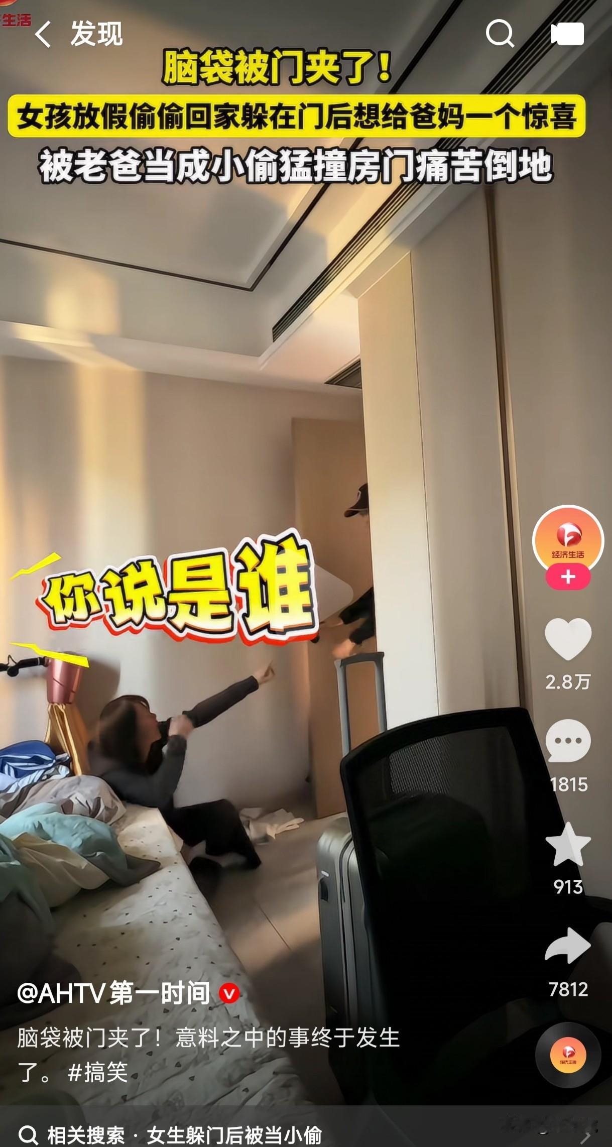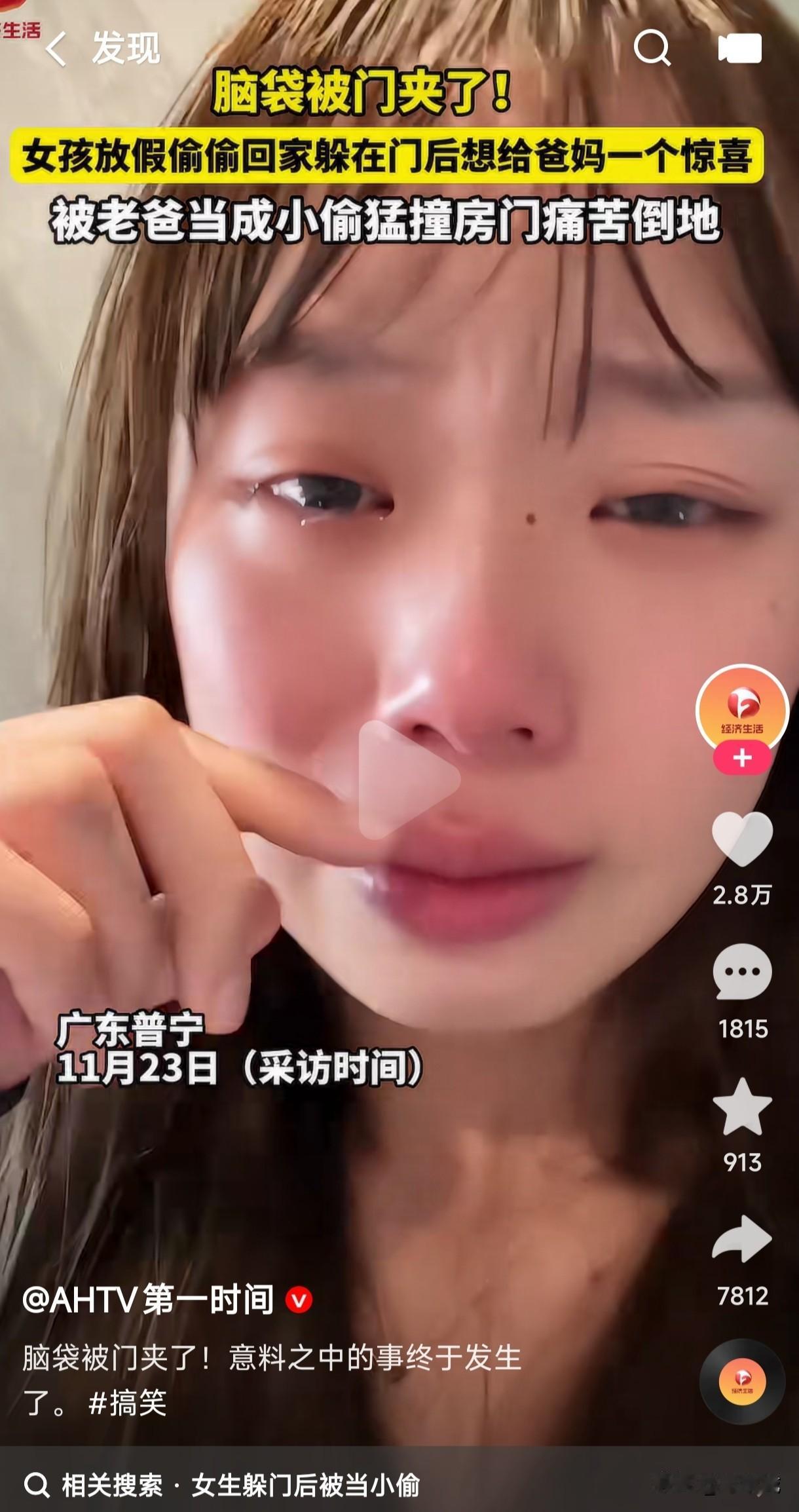 原谅我不厚道的笑了…… 女子哭诉自己的脑袋被门夹了,而且还是被自己的亲爹把自己当小偷了,故意使劲给夹的。 原来是她放假后偷偷回家想给爸妈一个惊喜,却发现爸妈都没有在家,过了一会后妈妈突然回家了,于是她就藏在了门后面,她在屋里的响动被妈妈以为家里进小偷了,于是妈妈打电话叫回了在外面打麻将的爸爸,爸爸回家进门后看到门后面有人,于是就使劲撞门夹她,直到她倒地后边哭边对老爸说是自己。 所以女子就一边哭一边把他被门夹的视频发到了网上,网友们看到她被门夹的脸上,头上的伤,还有肿起来的嘴巴,顿时也是哭笑不得,终于见到了被门夹过脑袋的人了,而且还是自己的亲爹夹的,这简直太搞笑了,亲爸把棉袄夹的直接破相了,这以后父女两还能亲近起来吗?