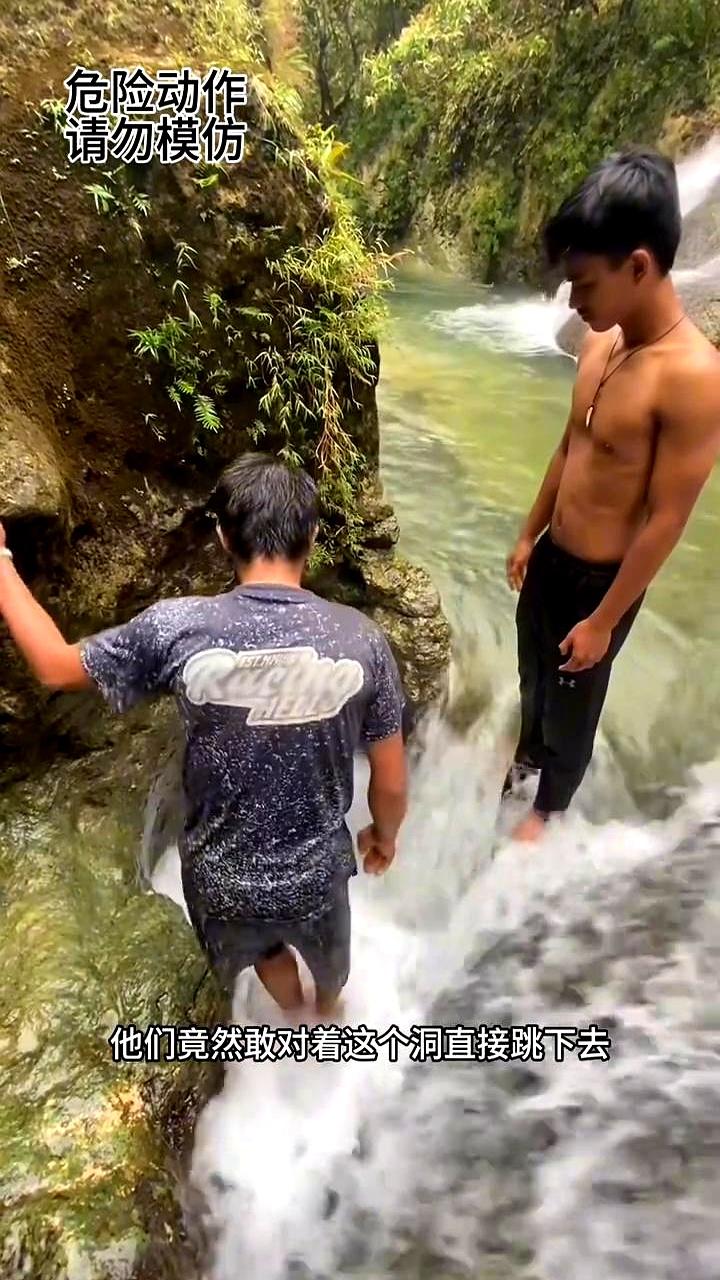 不得不说还是外国人的胆子比较大,你看这几个小孩子。 这帮孩子面对着那湍急的水流和黑漆漆的洞口,二话不说闭着眼就往里跳,看着那急匆匆的水流瞬间把人卷进黑暗里,光是看着这画面都让人心里跟着紧一下。 其实他们早就摸清了底细,顺着这水流冲个十几米就能直接钻到外面的大河里透气,就是因为知道这段路不长还通着外面,他们才敢这么肆无忌惮地拿命去玩这场刺激的漂流。