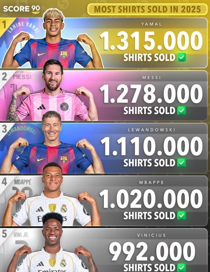 球衣销量能说明当前人气吧,亚马尔最高,力压梅西的存在。 莱万第三,姆巴佩第四,威尼修斯第五。 说明巴萨的造星能力很强,亚马尔又年轻代表未来球王,所以球衣销量最高。[大金牙]