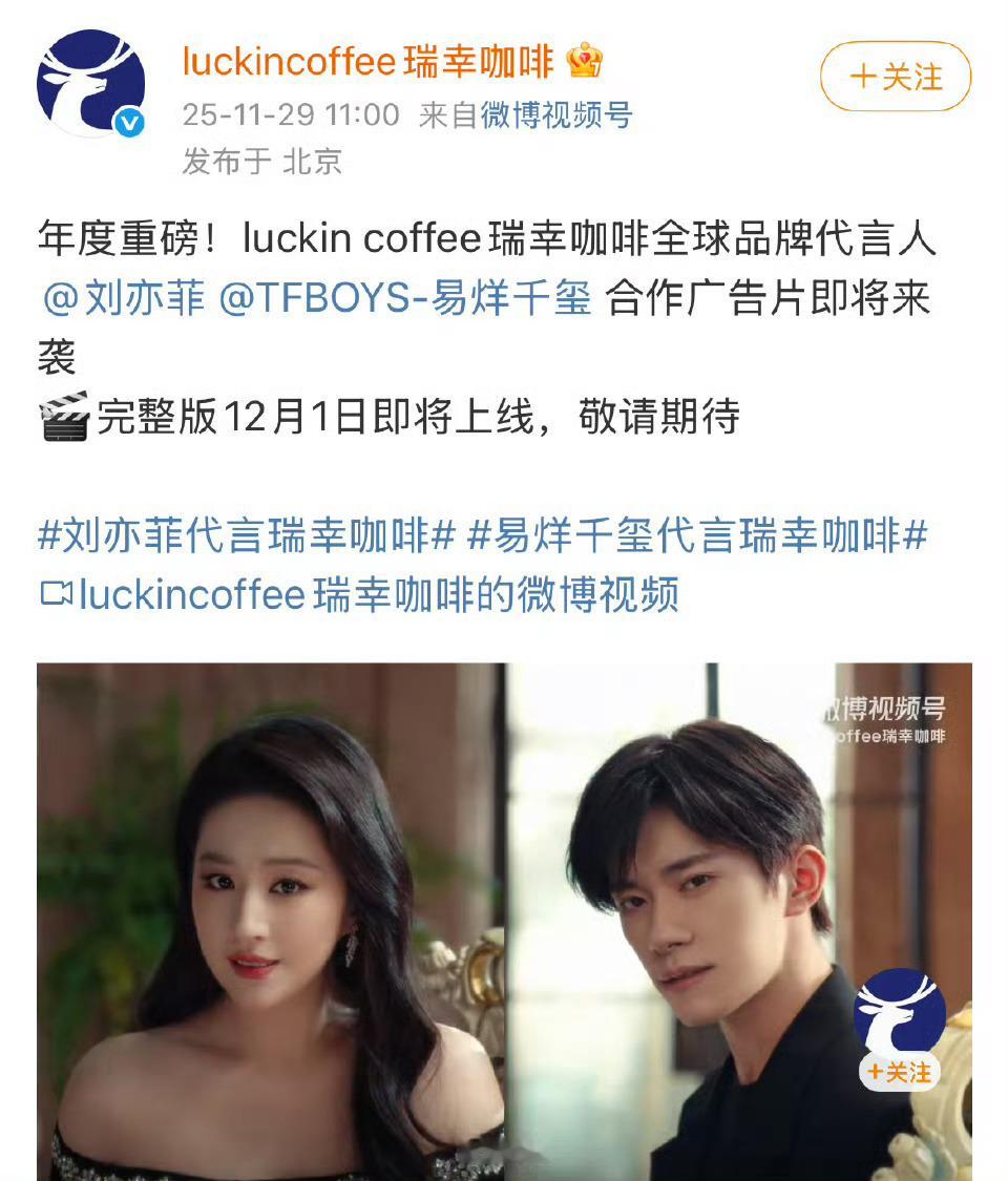 刘亦菲易烊千玺合作妈呀,我最喜欢的女演员和男演员,瑞幸这么有实力吗?
