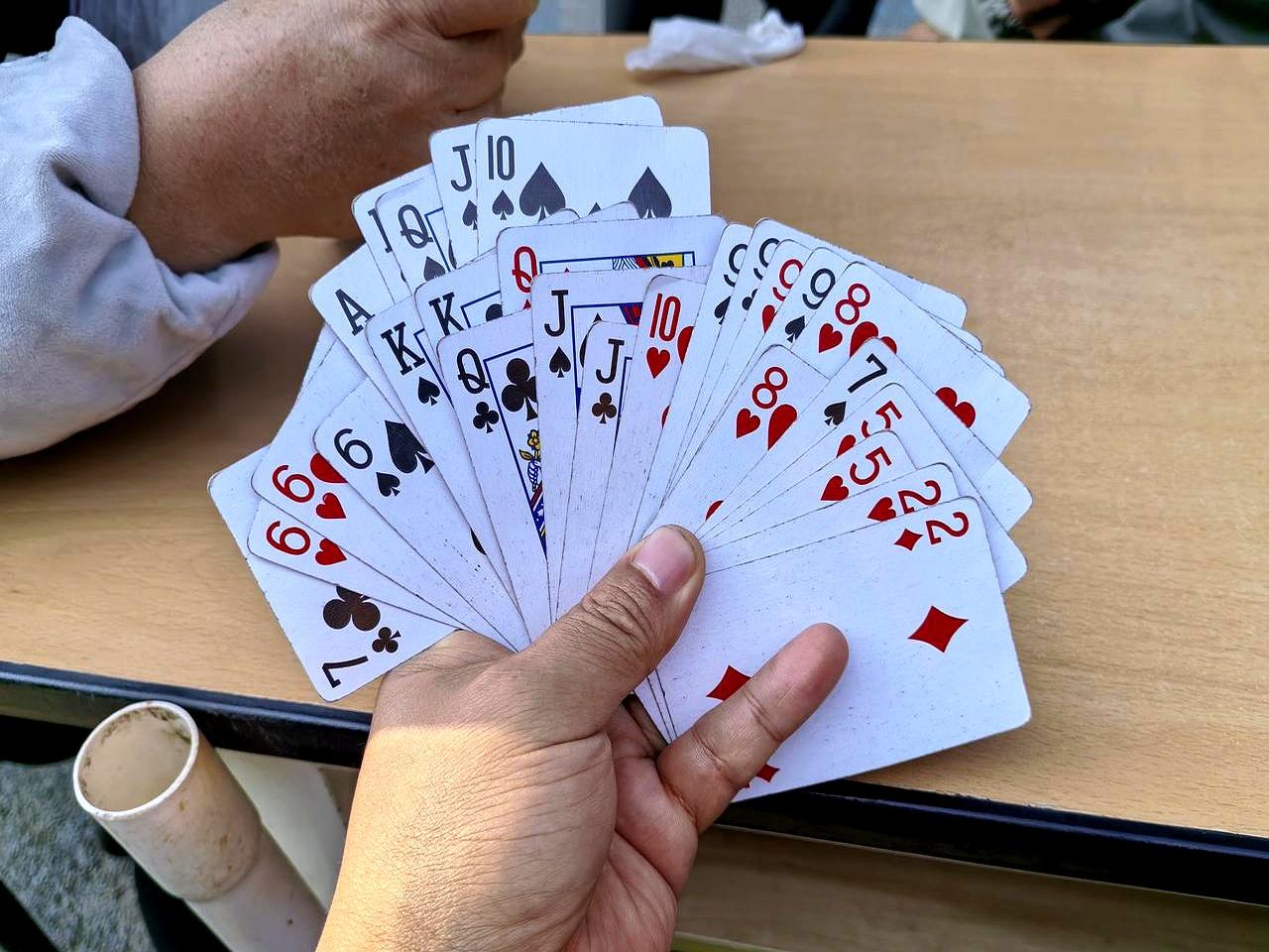 开两“三轮车”招摇过市吧! 掼蛋打6我们双贡,我把大王都送出去了,上家偏偏就还我一张小小的梅花7。 谁知道就这张7,让我直接凑成了天胡牌。 我先出567,再出JQK,然后三8夯对2,四个9跟上,最后甩出黑桃同花顺,一把就走完了。