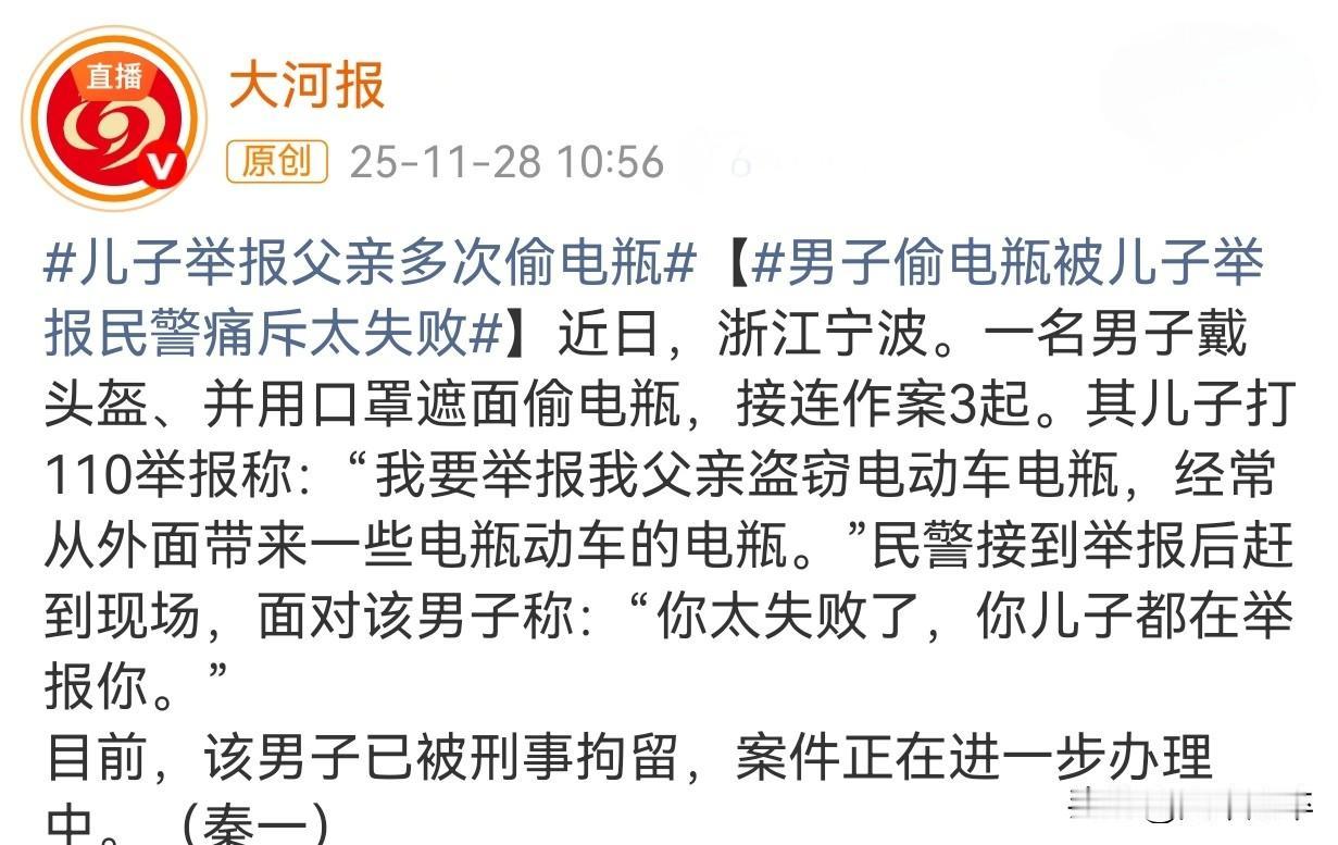 是“大义灭亲”还是“六亲不认”儿子举报父亲偷电瓶 ?!一个关于责任、正义与爱的事件。 浙江宁波一名男子多次实施盗窃,其作案手法固定佩戴头盔、口罩遮挡面部,专门盗窃电动车电瓶,已成功作案3起。他将盗窃所得的电瓶带回家中,这一行为被儿子长期察觉并默默记录。儿子在多次劝说父亲停止盗窃无效后,最终选择拨打110报警。举报的动机或许源于无法继续容忍父亲的违法行为及其对家庭的负面影响。民警接警后迅速赶到现场。面对涉嫌盗窃的男子,痛心且严厉地指出:“你太失败了,你儿子都在举报你。该男子因涉嫌盗窃已被警方刑事拘留,案件正在进一步办理中。 这孩子举报的时候该处于极度矛盾的心理状态,既受亲情羁绊,又深知父亲行为的违法性和危害性。也该充满了无奈与痛苦。而民警“太失败”的评价,直指身为父亲未能以身作则,反而沦为违法者,给孩子树立了极其负面的榜样。 简单地将儿子的行为定义为“大义灭亲”或“六亲不认”都过于片面。“六亲不认”通常指为人冷酷自私,毫无情义,为了自身利益可以不顾任何亲人。而“大义灭亲”则是在“大义”与“私亲”发生不可调和的冲突时,选择维护“大义”。儿子通过举报制止制止父亲的盗窃行为,及挽救了父亲继续滑落到罪恶的深渊,也保护了他人的财产。在多次劝说无效后,他意识到父亲的违法行为只会愈演愈烈,最终面临更严厉的法律制裁。报警是希望借助法律力量强行中断父亲的犯罪路径,是“置之死地而后生”的挽救尝试。一个真正“六亲不认”的人是不会感到痛苦。而这位儿子的举报行为,必然伴随着巨大的内心煎熬!他的行为表面上是“毁灭”实则是重建家庭赖以存在的根基。 最后民警那句“你太失败了,你儿子都在举报你”,既是对父亲的谴责,也暗含了对儿子不得已而为之的理解。也肯定这个孩子至少还有正确的是非观。电瓶小偷