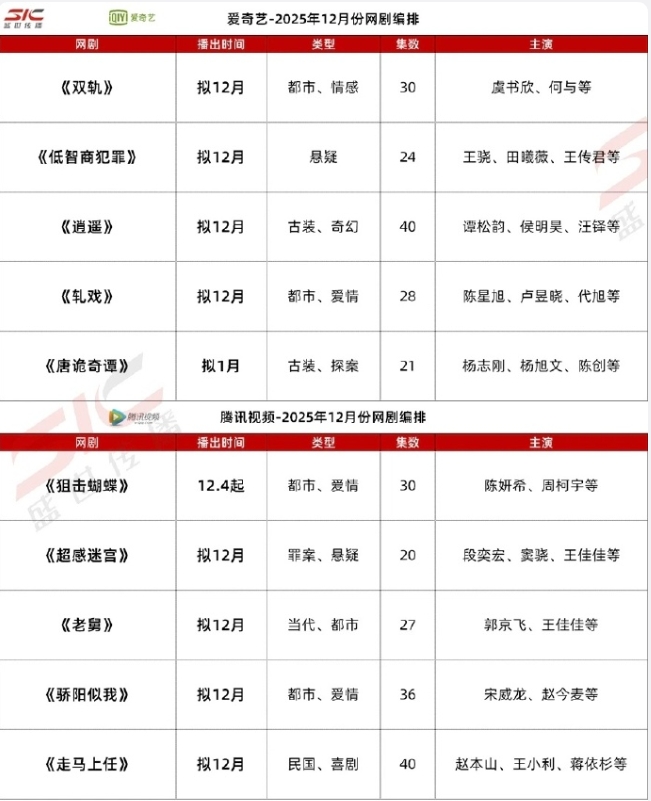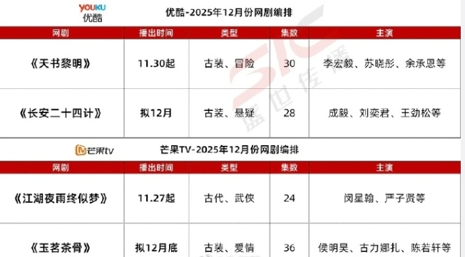 爱奇艺有虞书欣何与的《双轨》,谭松韵侯明昊的《逍遥》,陈星旭的《轧戏》,腾讯有宋威龙赵今麦的《骄阳似我》,优酷有成毅的《长安二十四计》,芒果有侯明昊古力娜扎的《玉茗茶骨》,三部现偶,三部古装,没有特别扛剧的演员,几位近一年都扑了一两部剧。