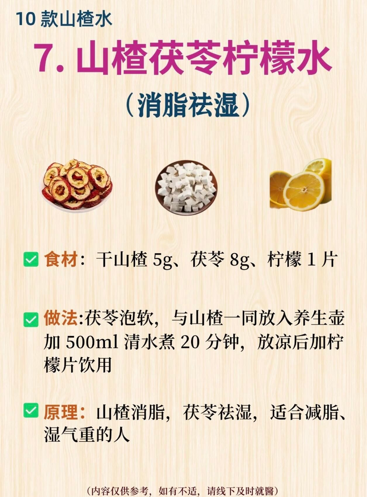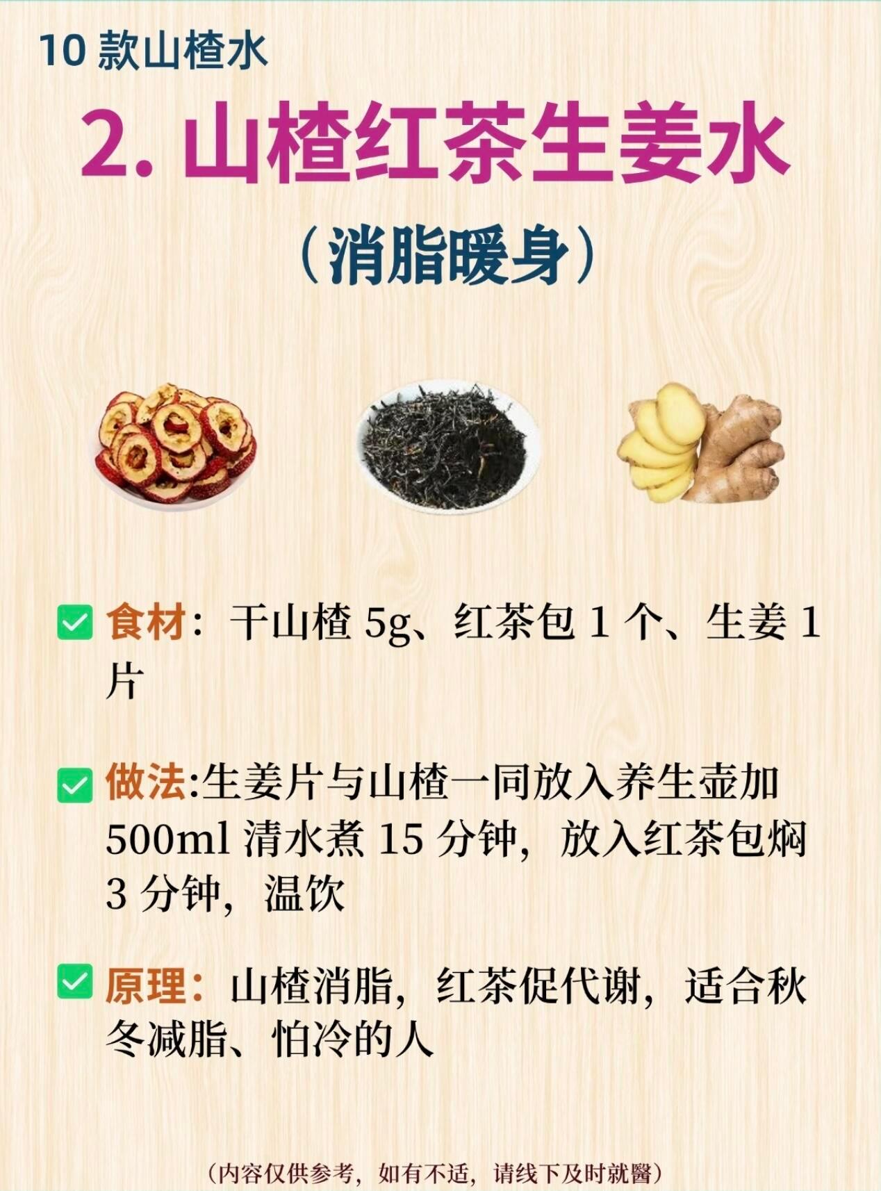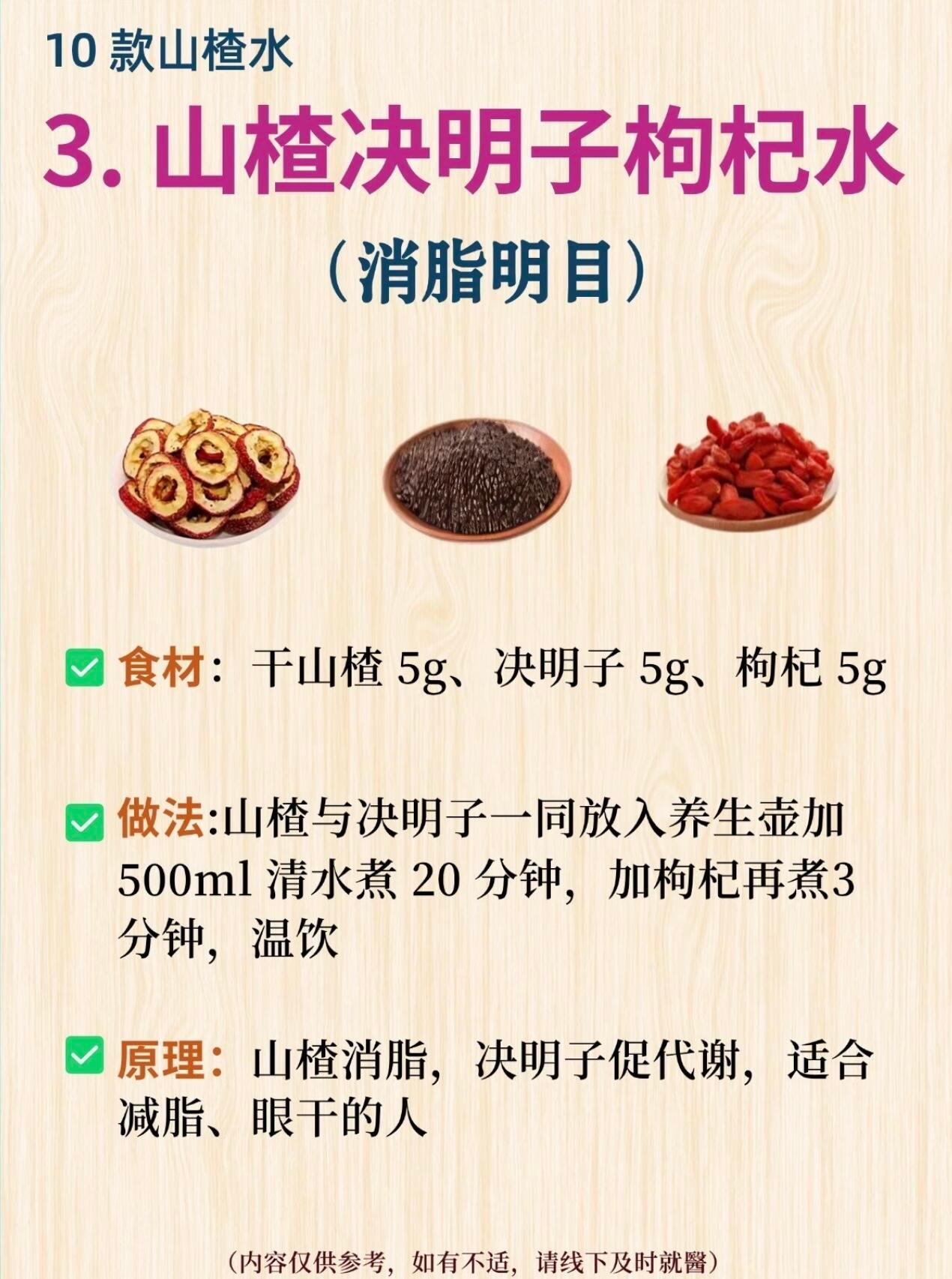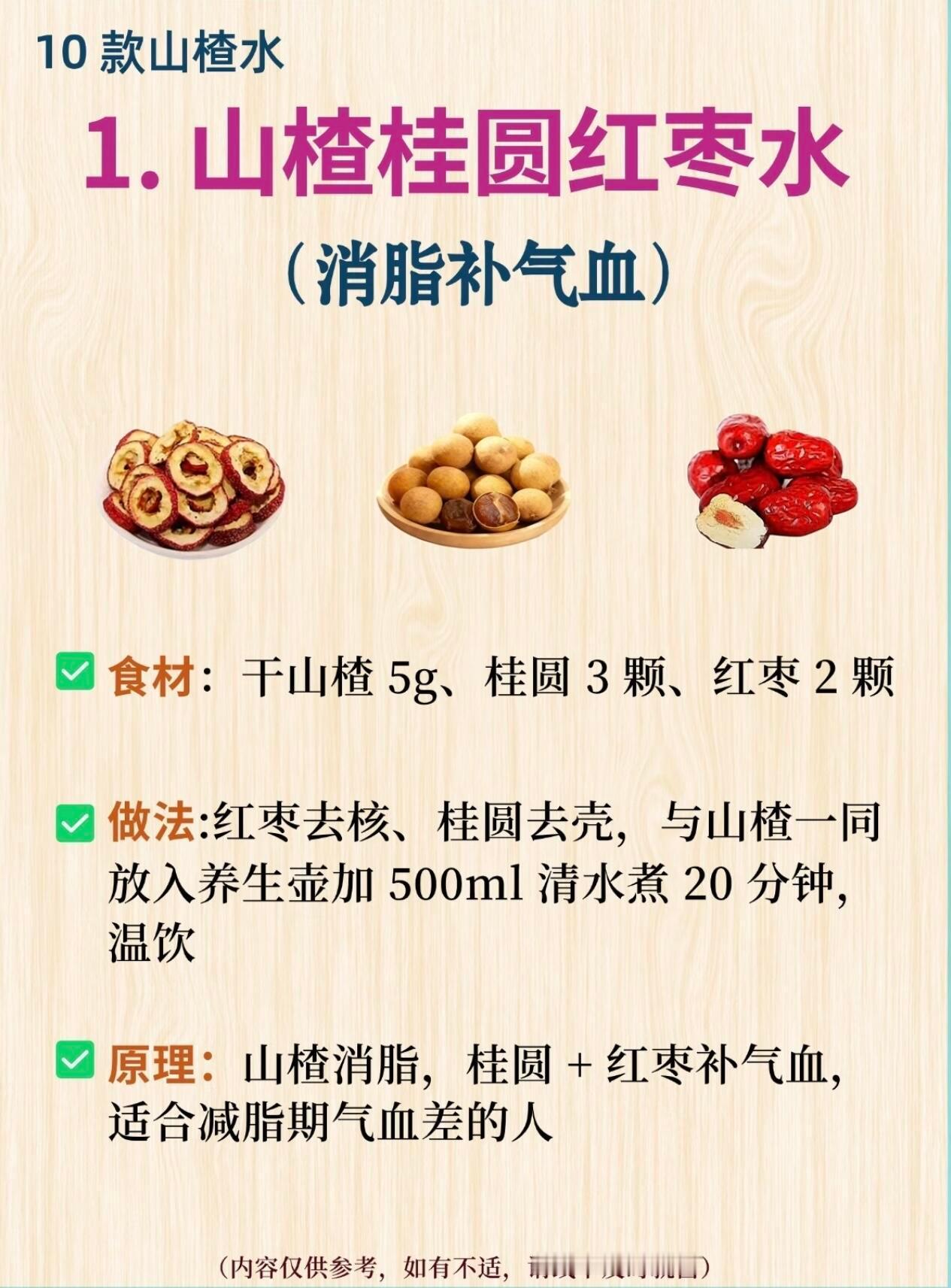 10种山楂水的创意渴法,去淤又减脂!🌿秋冬贴秋膘易积食、代谢慢,山楂可 “消脂化积、促代谢”,搭配荷叶、陈皮、决明子等食材,既能强化减脂效果,又能温和调理,尤其适合想减脂、积食腹胀的人。🌸依据:《本草纲目》记载山楂 “酸,甘,微温,能消食化积,活.血化瘀”,现代研究也表明山楂中的成分可促进脂肪代谢。10种山楂水的创意渴法,去淤又减脂!收藏起来慢慢喝~✅1. 山楂桂圆红枣水(消脂补气血)✅2. 山楂红茶生姜水(消脂暖身)✅3. 山楂决明子枸杞水(消脂明目)✅4. 山楂荷叶水(消脂燃脂)✅5. 山楂陈皮水(消积腹胀)✅6. 山楂玫瑰水(消脂理.气)✅7. 山楂茯苓柠檬水(消脂祛湿)✅8. 山楂红糖生姜水(消脂暖宫)✅9. 山楂百合冰糖水(消脂安.神)✅10. 山楂菊花冰糖水(消脂清燥)⚠️ 小提醒:山楂酸性较强,需用干山楂煮制,避免空腹饮用,煮制时间 15-25 分钟为宜健康养生食疗养生