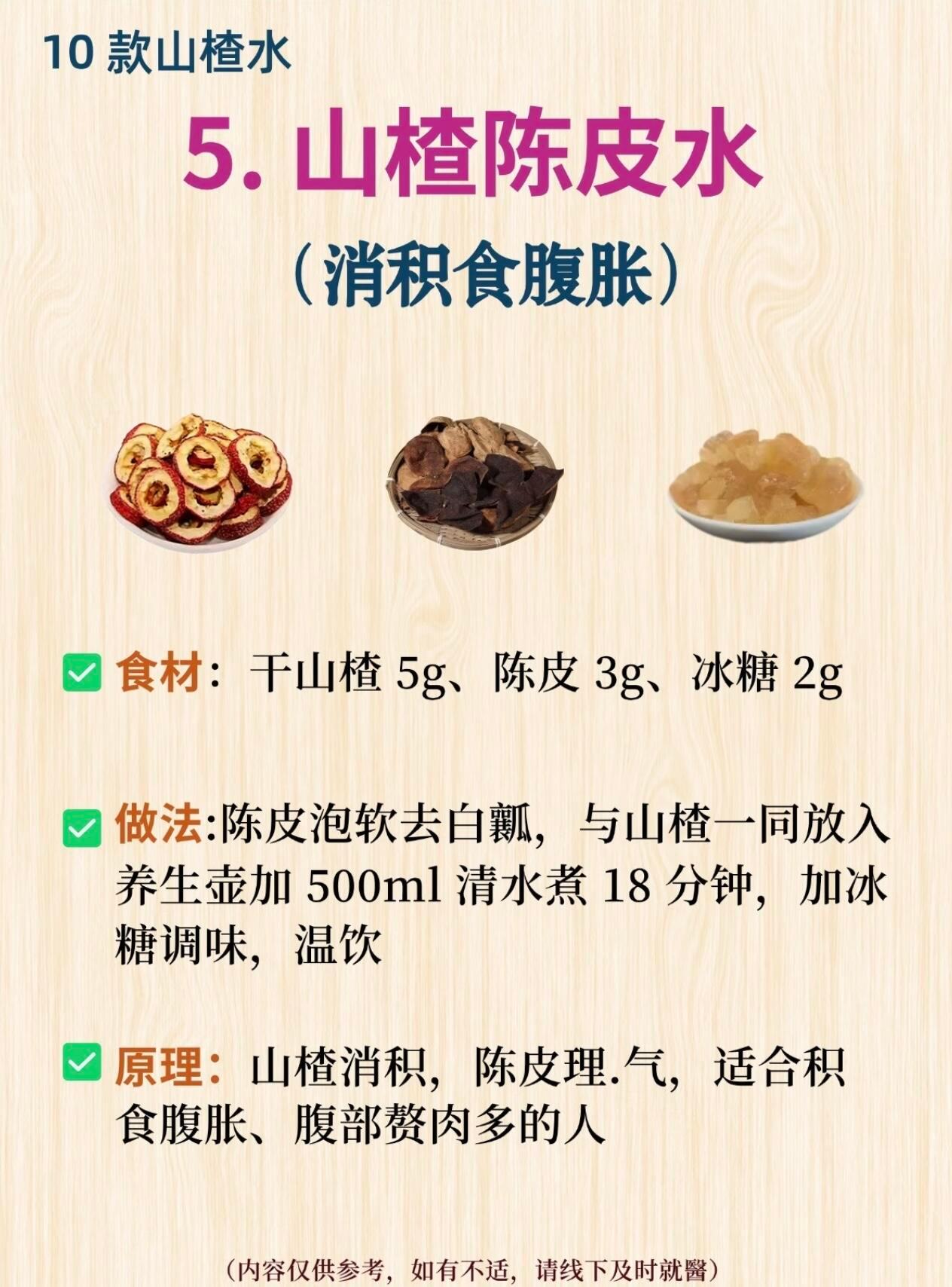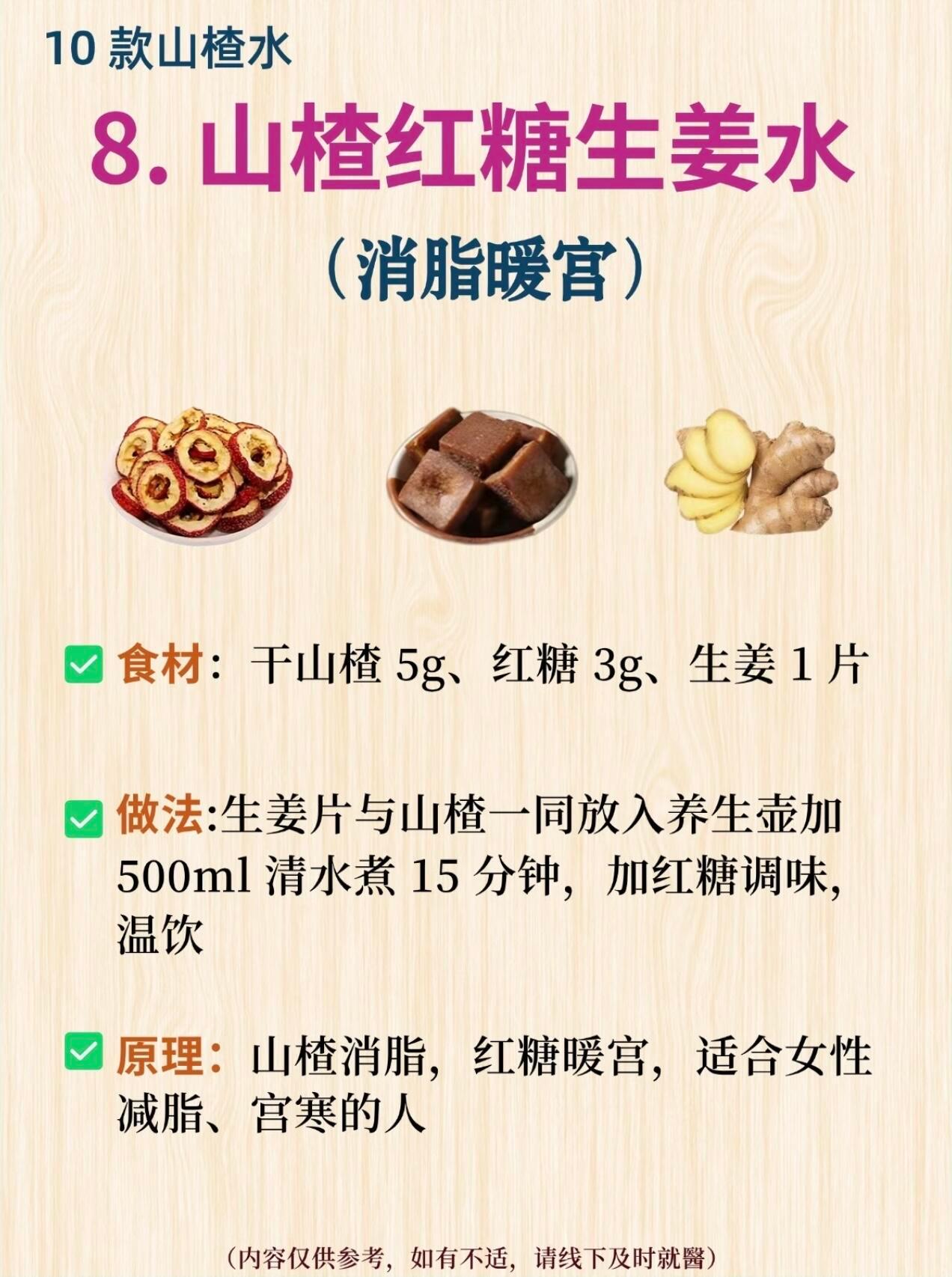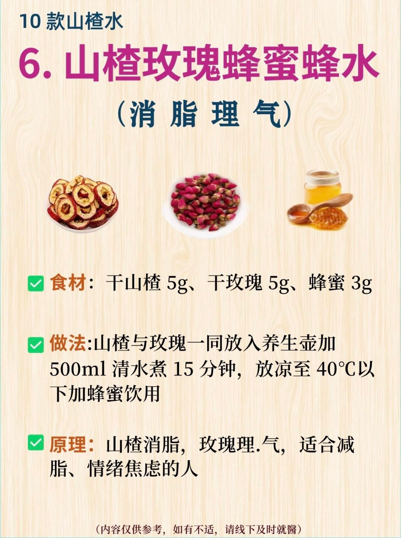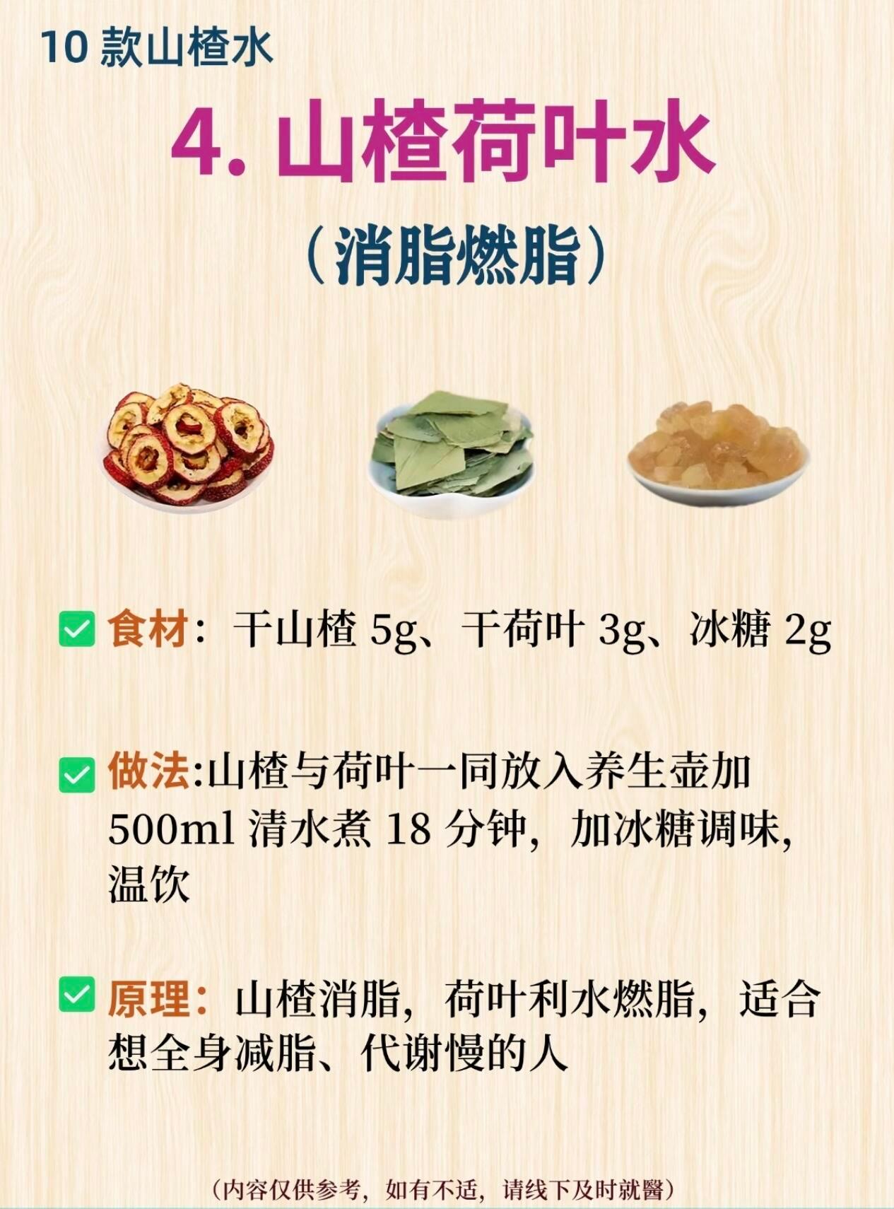 10种山楂水的创意渴法,去淤又减脂!🌿秋冬贴秋膘易积食、代谢慢,山楂可 “消脂化积、促代谢”,搭配荷叶、陈皮、决明子等食材,既能强化减脂效果,又能温和调理,尤其适合想减脂、积食腹胀的人。🌸依据:《本草纲目》记载山楂 “酸,甘,微温,能消食化积,活.血化瘀”,现代研究也表明山楂中的成分可促进脂肪代谢。10种山楂水的创意渴法,去淤又减脂!收藏起来慢慢喝~✅1. 山楂桂圆红枣水(消脂补气血)✅2. 山楂红茶生姜水(消脂暖身)✅3. 山楂决明子枸杞水(消脂明目)✅4. 山楂荷叶水(消脂燃脂)✅5. 山楂陈皮水(消积腹胀)✅6. 山楂玫瑰水(消脂理.气)✅7. 山楂茯苓柠檬水(消脂祛湿)✅8. 山楂红糖生姜水(消脂暖宫)✅9. 山楂百合冰糖水(消脂安.神)✅10. 山楂菊花冰糖水(消脂清燥)⚠️ 小提醒:山楂酸性较强,需用干山楂煮制,避免空腹饮用,煮制时间 15-25 分钟为宜健康养生食疗养生