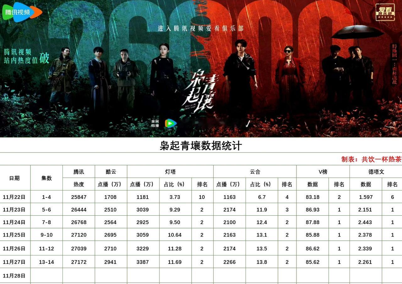 《枭起青壤》云合占比13.8%持续横盘 后面也没机会爆了,尾鱼已播的《司藤》集均6900万,《西出玉门》集均3500万,《七根心简》集均1700万,《枭起青壤》也就1000多万的水平,这几部剧的好看程度和云合集均也是成正比的,《司藤》>《西出玉门》>《七根心简》,《枭起青壤》目前的剧情比较一般,后面这两部的剧情比前面两部水平差挺多。