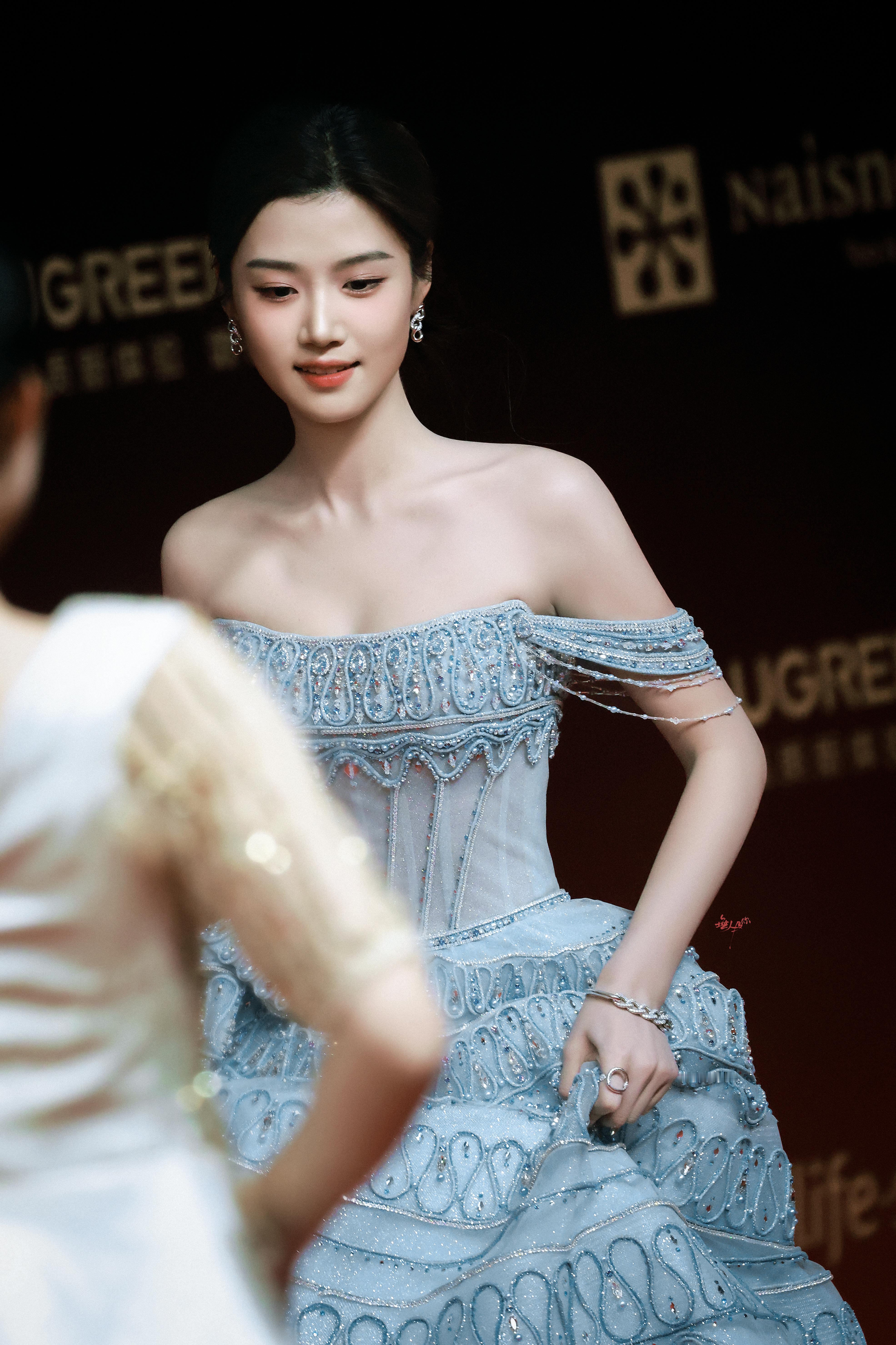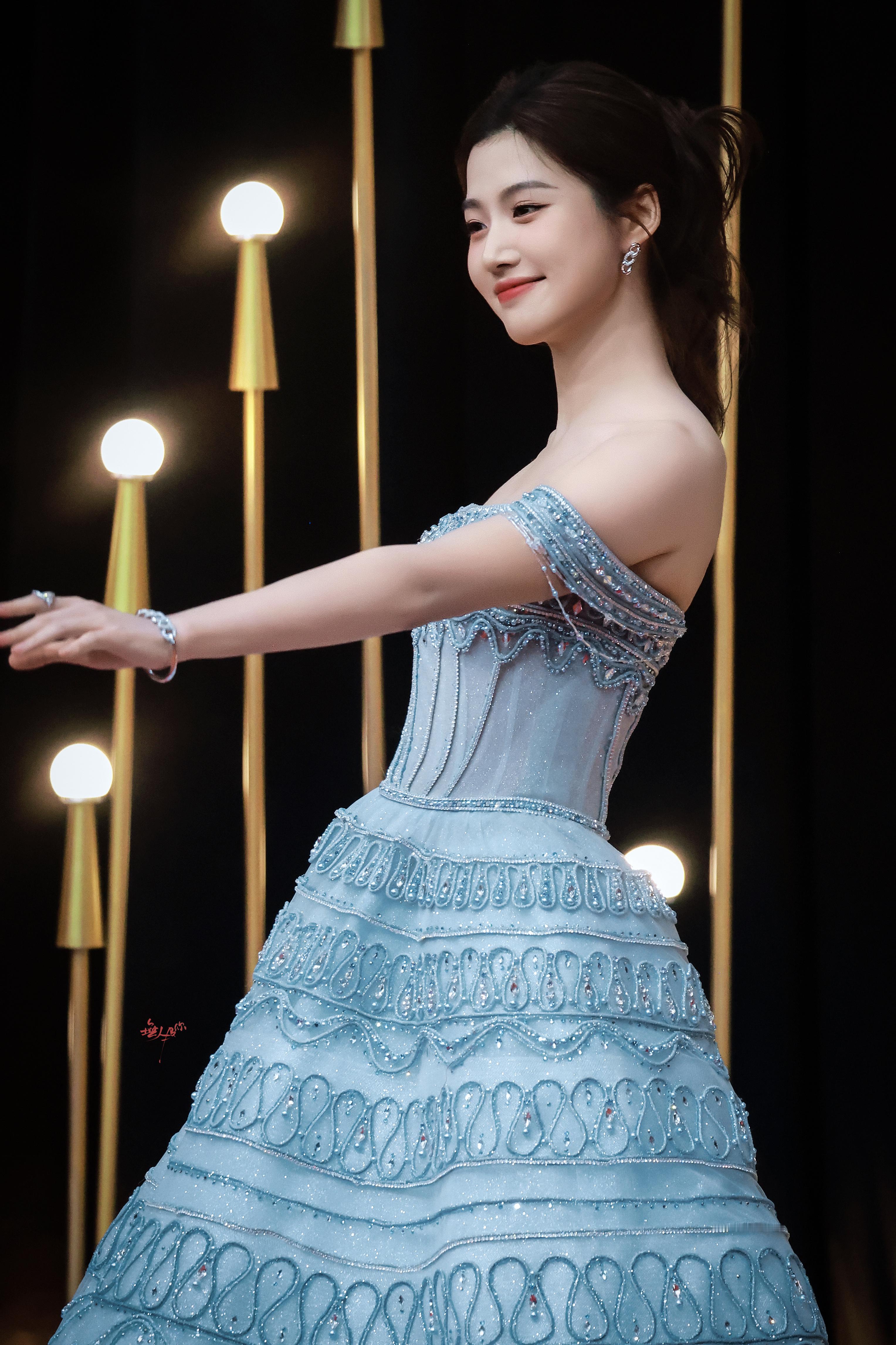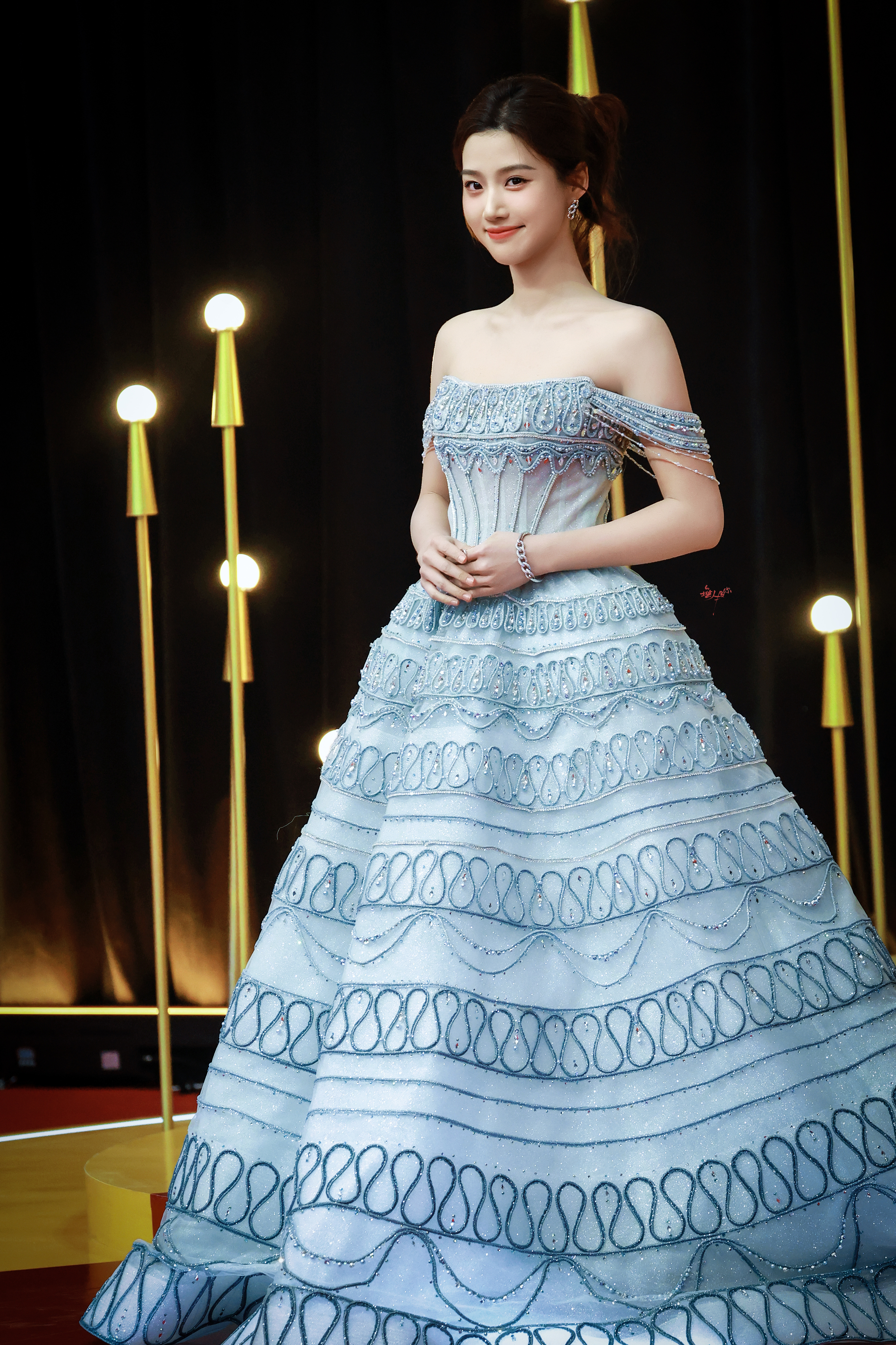 卢昱晓 淡蓝蓬裙缀满细腻纹路,温柔又华丽,宛如落入凡间的星光。卢昱晓工作室卢昱晓公主提裙