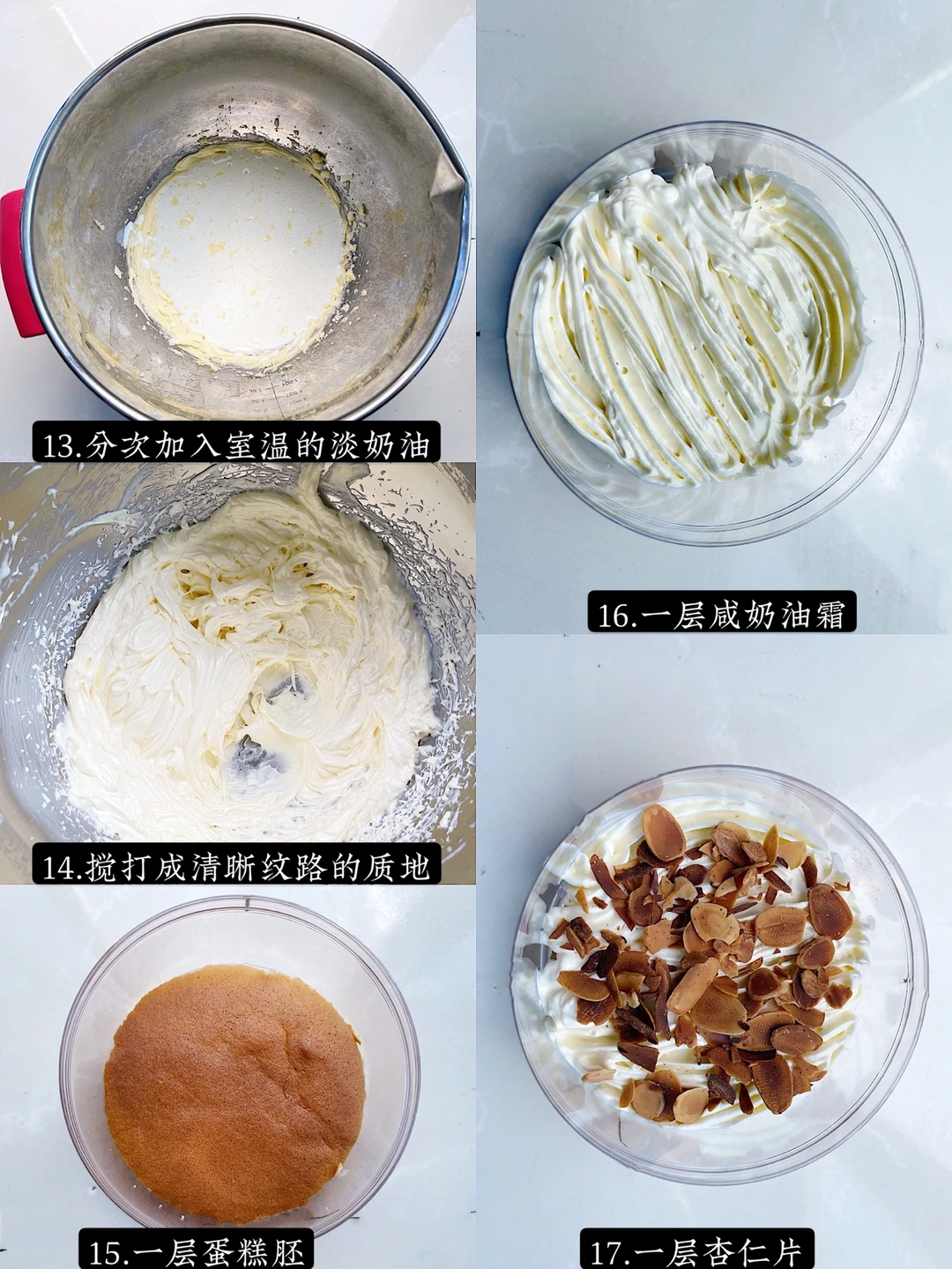 6️⃣打发好的咸奶油装进裱花袋里,按照一片蛋糕胚,一层咸奶油,一层杏仁片的顺序组装好