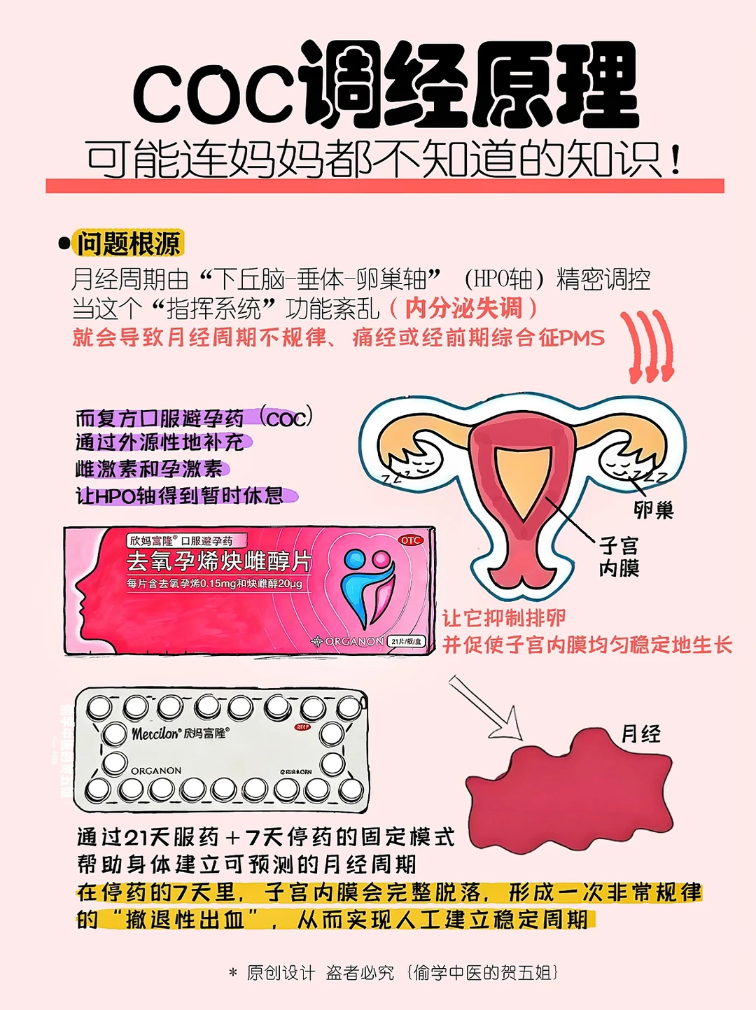 👉而它含外源性雌激素和孕激素,每片含去氧孕烯0.15mg、炔雌醇20μg,它能让“累坏了”的HPO轴暂时休息,给内分泌系统“放个假”~