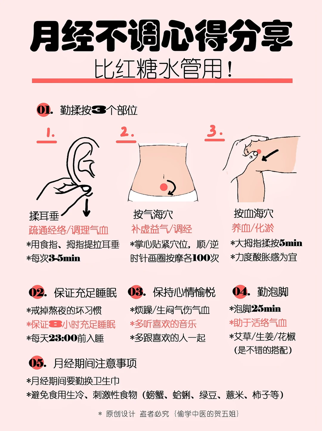 1️⃣ 经期前按揉耳垂、气海穴、血海学按,🉑️疏通经络~调气血~
