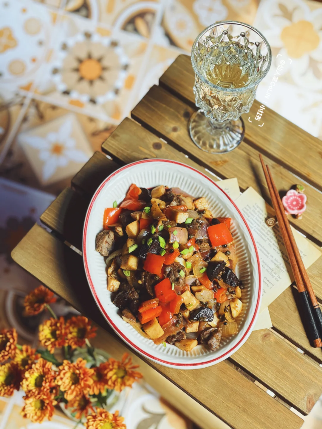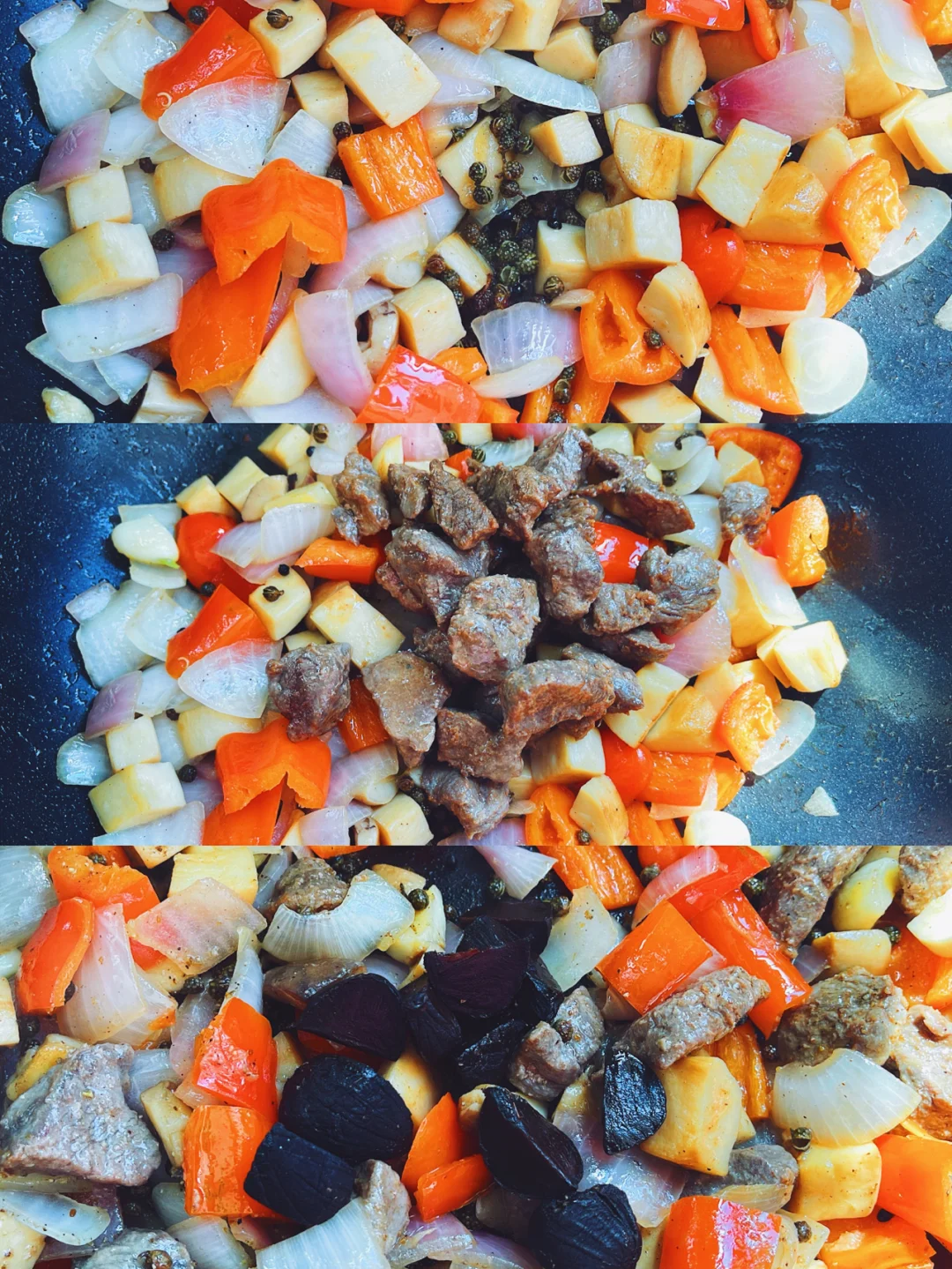 4️⃣把杏鲍菇、花椒、蒜瓣,开中大火炒出香味以后放其他配菜进行翻炒,放1勺黑胡椒和盐翻炒均匀,再倒入牛肉粒和黑蒜,起锅前倒入半碗白葡萄酒,翻炒一下,提味。