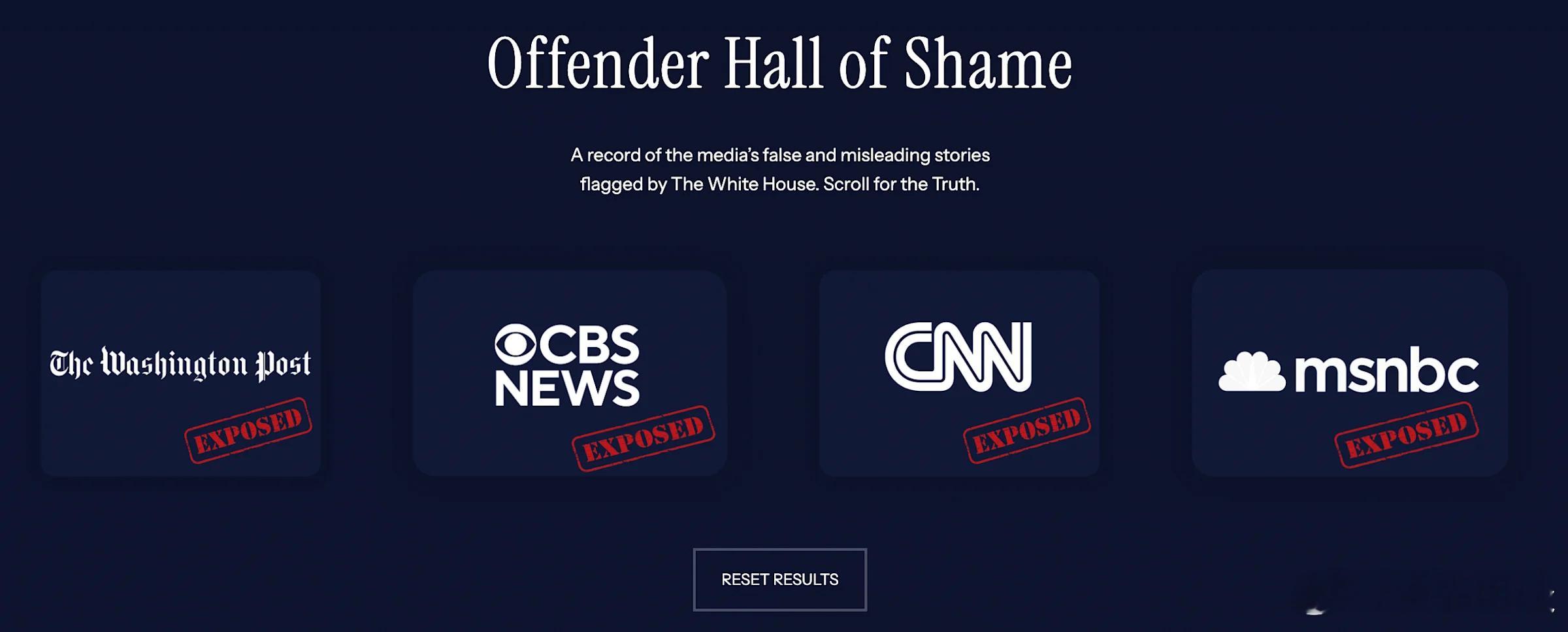 【特朗普在白宫网站上公布“本周媒体冒犯者”和“耻辱榜”】[当微博上讨论“封存”的时候,一度标榜“新闻自由”的美国的白宫在......](Deadline)本周,唐纳德·特朗普不仅满足于对女记者进行人身攻击,这位美国总统现在还决定通过一个新的白宫网站页面,正式向所谓的“人民之敌”在网络上宣战。11月26日,两名西弗吉尼亚州国民警卫队成员在华盛顿特区遭枪击身亡,引发悲剧。与此同时,前《学徒》节目主持人乔·拜登周五在社交媒体上发布了一系列揭露真相的帖子,并再次抨击拜登的政治遗产。在此背景下,美国行政部门发起了一场针对“本周媒体罪犯”的线上打击行动。该页面承诺记录“白宫标记的媒体虚假和误导性报道”,并提供了一个追溯数月的详细“耻辱榜”。页面还敦促访问者“滚动浏览真相”。《波士顿环球报》和英国《独立报》与哥伦比亚广播公司新闻一起位列“媒体违规者”榜首,一向好斗的白宫将这一“违规行为”列为:“媒体歪曲了特朗普总统要求追究国会议员煽动叛乱责任的呼吁,称他呼吁‘处决’他们。”过去 40 年里,凡是活过的人都知道,特朗普一直以攻击媒体(也就是所谓的“假新闻”)为生,所以这没什么新鲜的。然而,今天白宫社交媒体和新闻秘书卡罗琳·莱维特宣布的消息表明,此事的范围和深度有所不同。该网站列出了数十个令白宫不快的电视节目、报纸和网络文章,还设有“耻辱榜”四人组和排行榜。哥伦比亚广播公司新闻网(CBS News)、《华盛顿邮报》(WaPo)、美国有线电视新闻网(CNN)和微软全国广播公司(MSNBC)显然名列前茅,紧随其后的是特朗普起诉的《纽约时报》、Politico以及鲁珀特·默多克旗下的《华尔街日报》 。特朗普可能正就《华尔街日报》将他与已故恋童癖者(也是特朗普90年代的派对好友)杰弗里·爱泼斯坦联系起来的报道,向其索赔150亿美元。但是,与面临10亿至50亿美元诉讼威胁的英国广播公司(BBC)不同,福克斯新闻似乎并未出现在任何媒体违规者名单上。白宫使出浑身解数,用类似词云的形式再次列出一些所谓的“罪魁祸首”。屡遭攻击的深夜脱口秀主持人吉米·坎摩尔、塞思·梅耶斯和斯蒂芬·科尔伯特这次侥幸逃过一劫,但特朗普团队也把其他一些媒体也牵扯了进来——甚至包括一些支持“让美国再次伟大”(MAGA)的媒体。