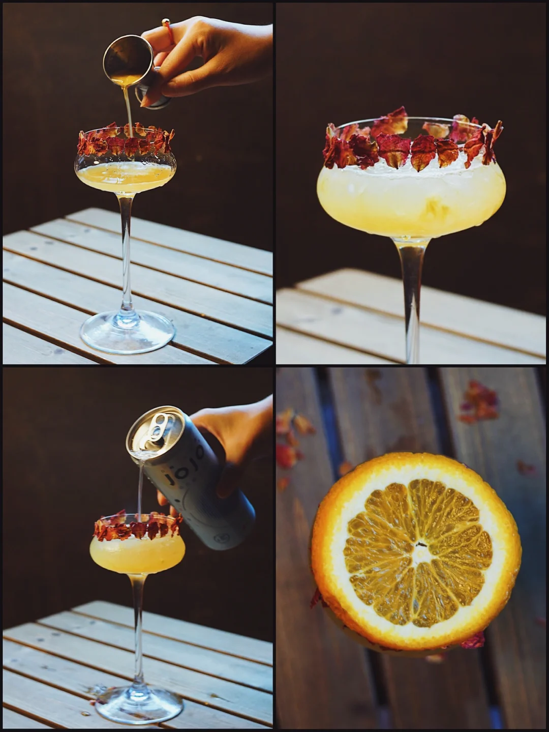 🥂基底是橙子的酸甜🍊与清浅的海盐气泡酒相交融合。包裹着柚子的微苦。杯口蘸满糖浆的可食用玫瑰花瓣。让口腔的层次更加丰富。入口片刻,气泡绵密的消散在舌尖。周遭因工作带来的烦闷一扫而空。