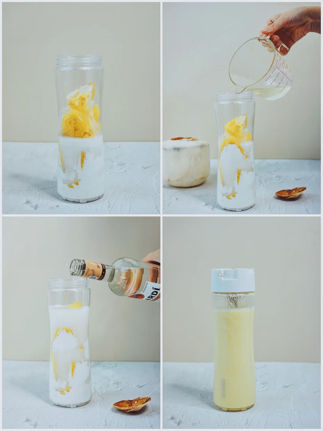 ②依次把菠萝、椰浆、椰汁、柠檬汁和朗姆酒放入榨汁机里