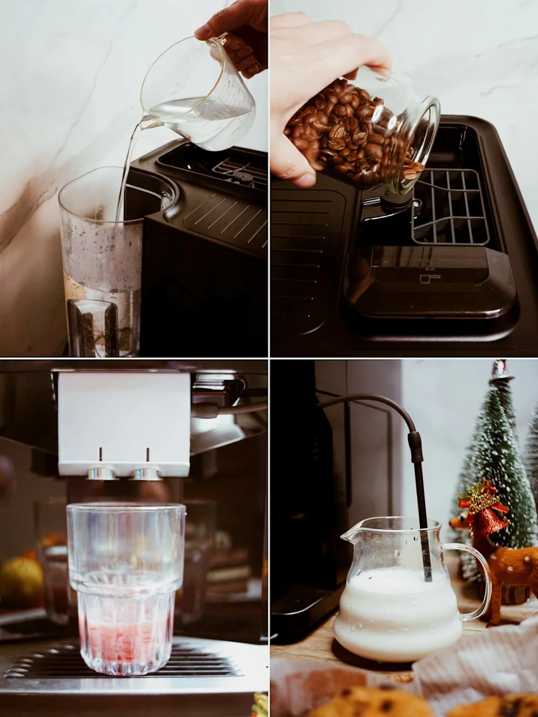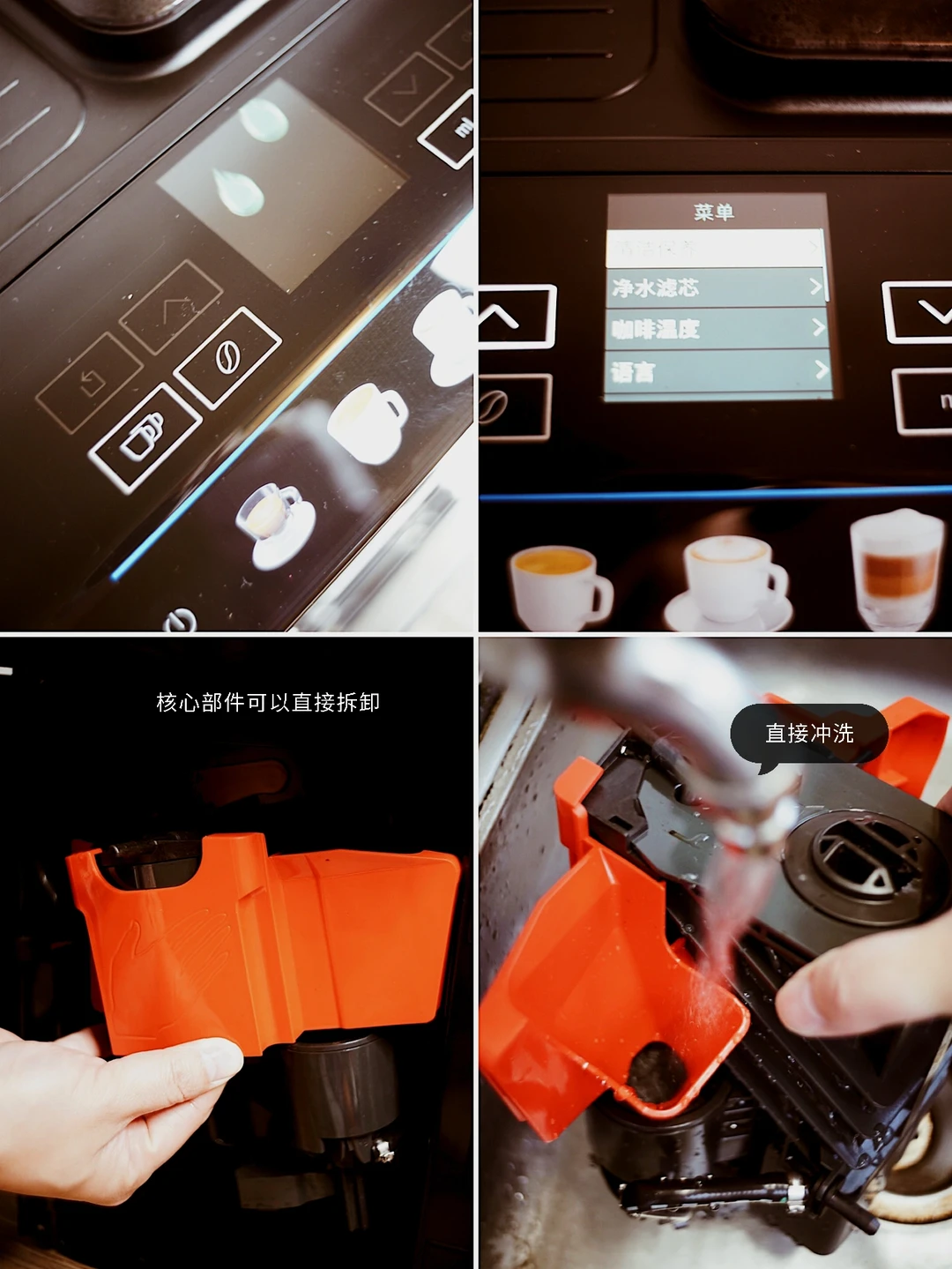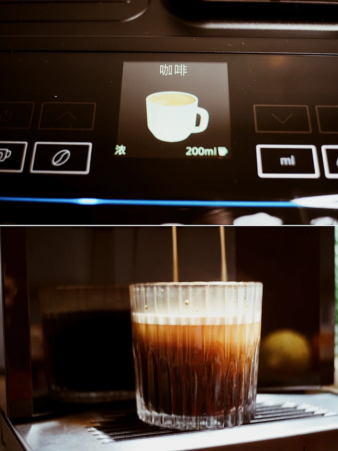 ▪️咖啡功能区是全彩中文触屏的设计。对于初次尝试咖啡机的小白来说,一眼就能看懂。一共有6️⃣种口味可以选择,意式浓缩、黑咖啡、卡布奇诺、拿铁玛奇朵、奶泡和热水。你想喝哪一款,直接触摸相对应的图标🖱️就可以了。就连奶泡🥛都可以自动打发。完全不用你掌握这项技能。打出来的奶泡还hin细腻绵密。做出来的咖啡有非常好看的分层[萌萌哒R]咖啡的浓度细致到也可以根据个人的喜好进行选择。淡-中等-浓-非常浓-加倍香浓,一共有5️⃣档。喝意式浓缩的时候,浓缩咖啡的量也可以进行选择。