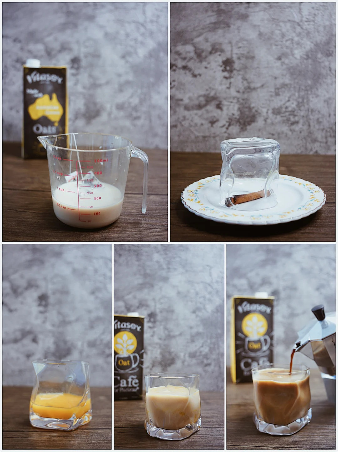 配方:肉桂1根+橙子1个+红茶包1袋+燕麦奶150ml+意式浓缩咖啡50ml