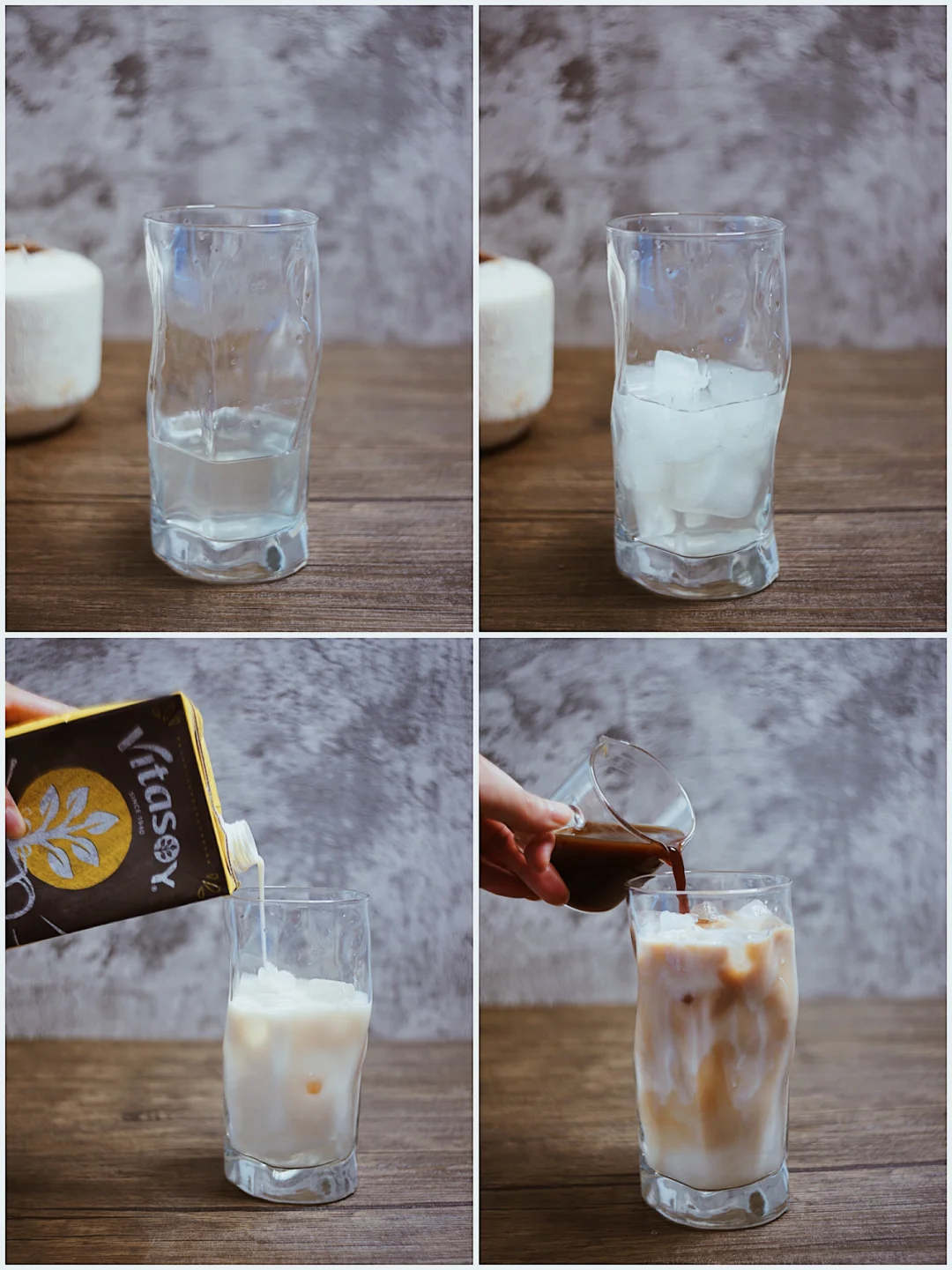 3️⃣再往杯中依次倒入新鲜椰汁、燕麦奶和萃取好的浓缩咖啡。