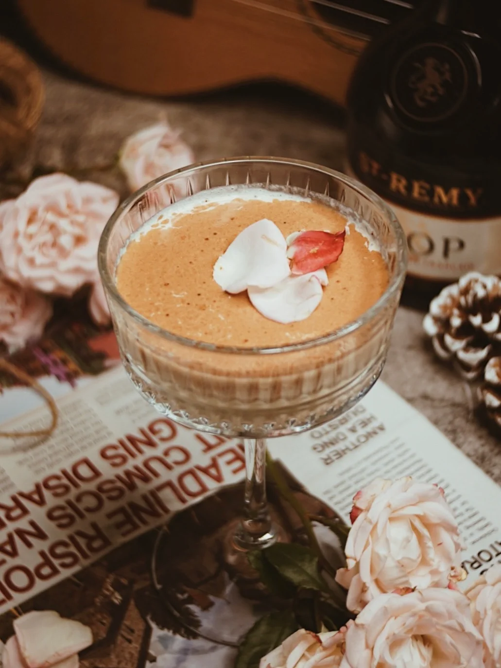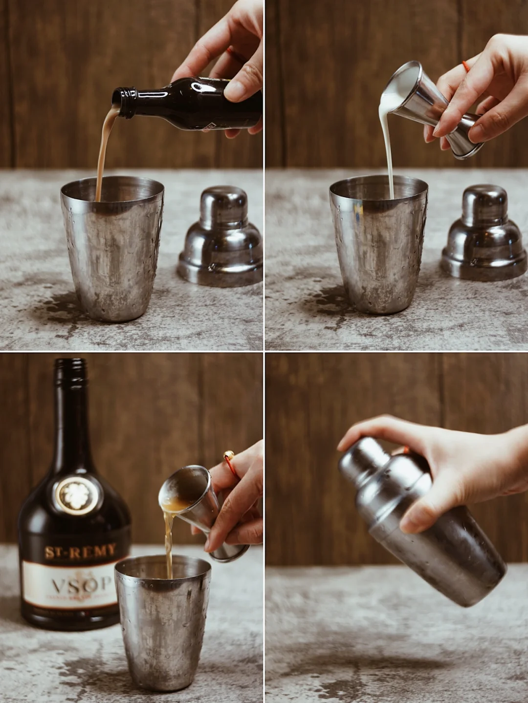▪️调饮步骤:依次将50ml圣雷米vsop白兰地、50ml百利甜酒、50ml淡奶油按照1:1:1的比例倒入雪克壶里,加4块冰块,疯狂摇至壶身起雾,倒入杯里,表面撒上一点可可粉