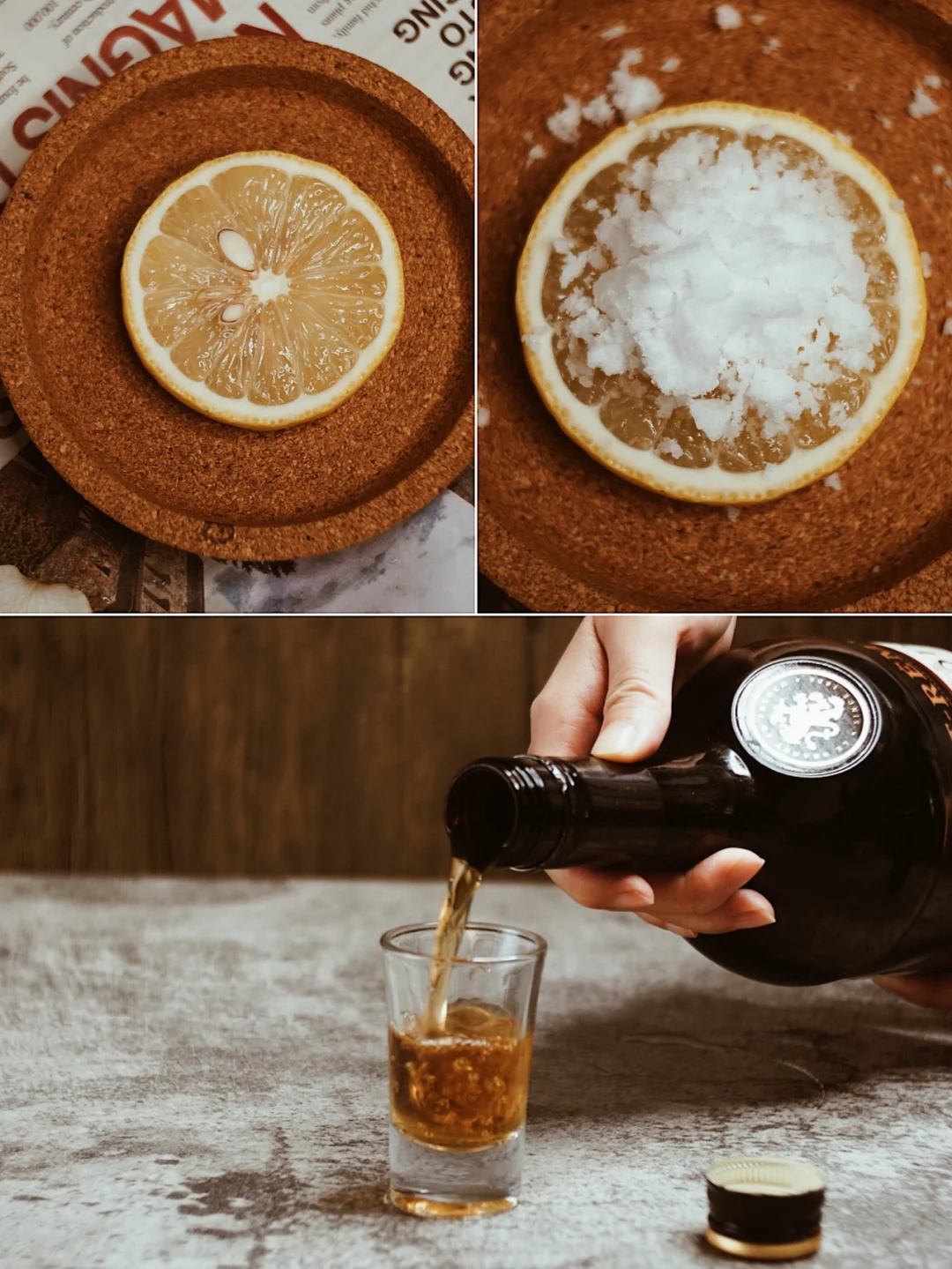 💭这款鸡尾酒是白兰地经典的餐后喝法。先将柠檬片🍋对折,包住砂糖放入口中,吸入柠檬肉,当感觉到柠檬的酸甜以后一口干掉杯中的白兰地🥃如此,3种截然不同的食材在口中达到平衡。