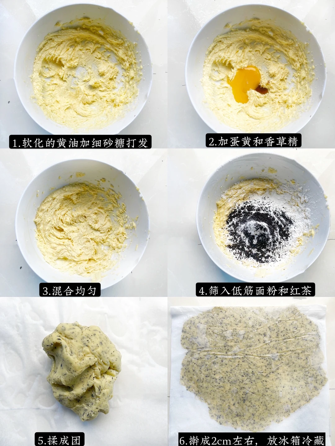 红茶酥饼:黄油100g 蛋黄1个 细砂糖50g 低筋面粉140g 伯爵红茶4g