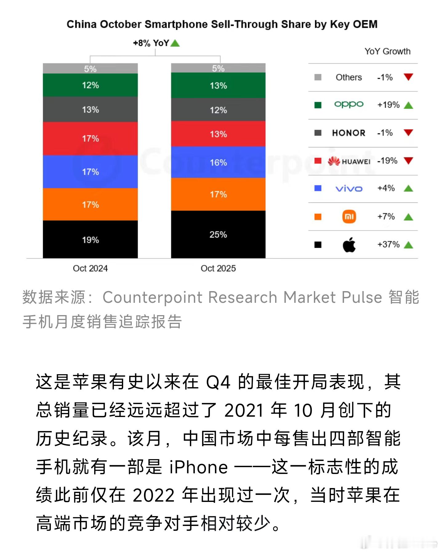 苹果10月全球手机份额飙至24.2%iPhone在10月份,不仅在中国创下销量新纪录,在全球也创下新纪录。主要是iPhone 17系列的爆发,尤其iPhone 17标准版。一向挤牙膏的苹果稍微多挤一点就卖爆了,这就是品牌力啊。