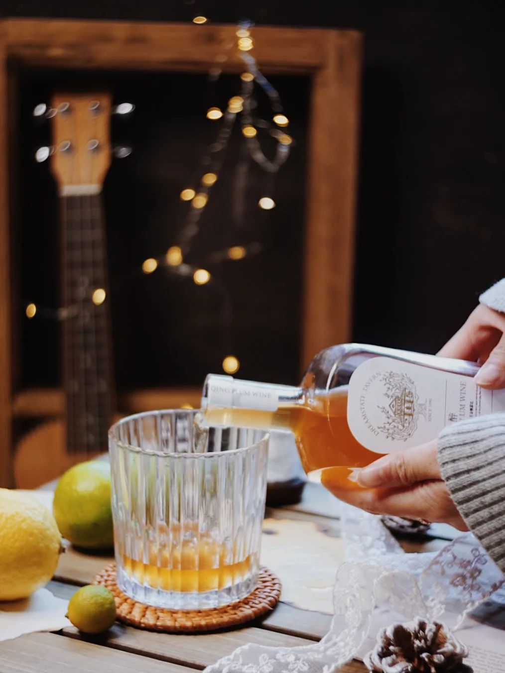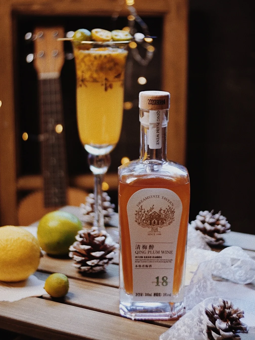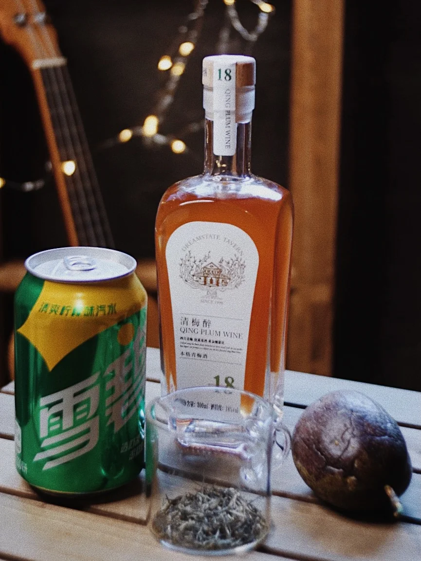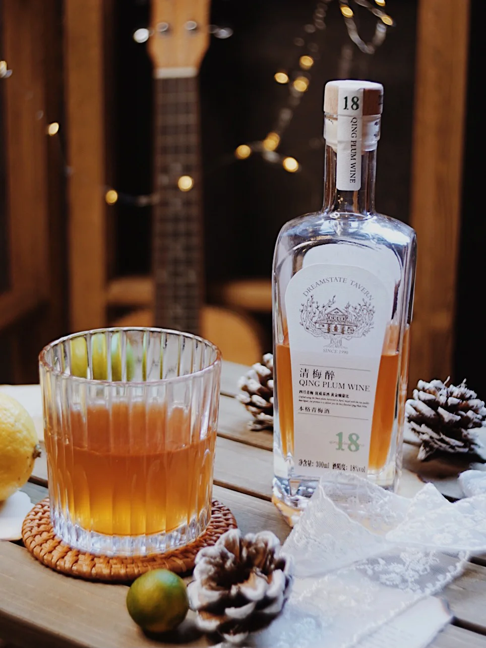 ⚠️如果酒量好的朋友,可以自行选择加点朗姆酒或者威士忌。调制这款青梅酒我选用的是梦境树屋的清梅醉果酒🍸光听名字就已经让人沉醉其中,不忍被打扰🌌