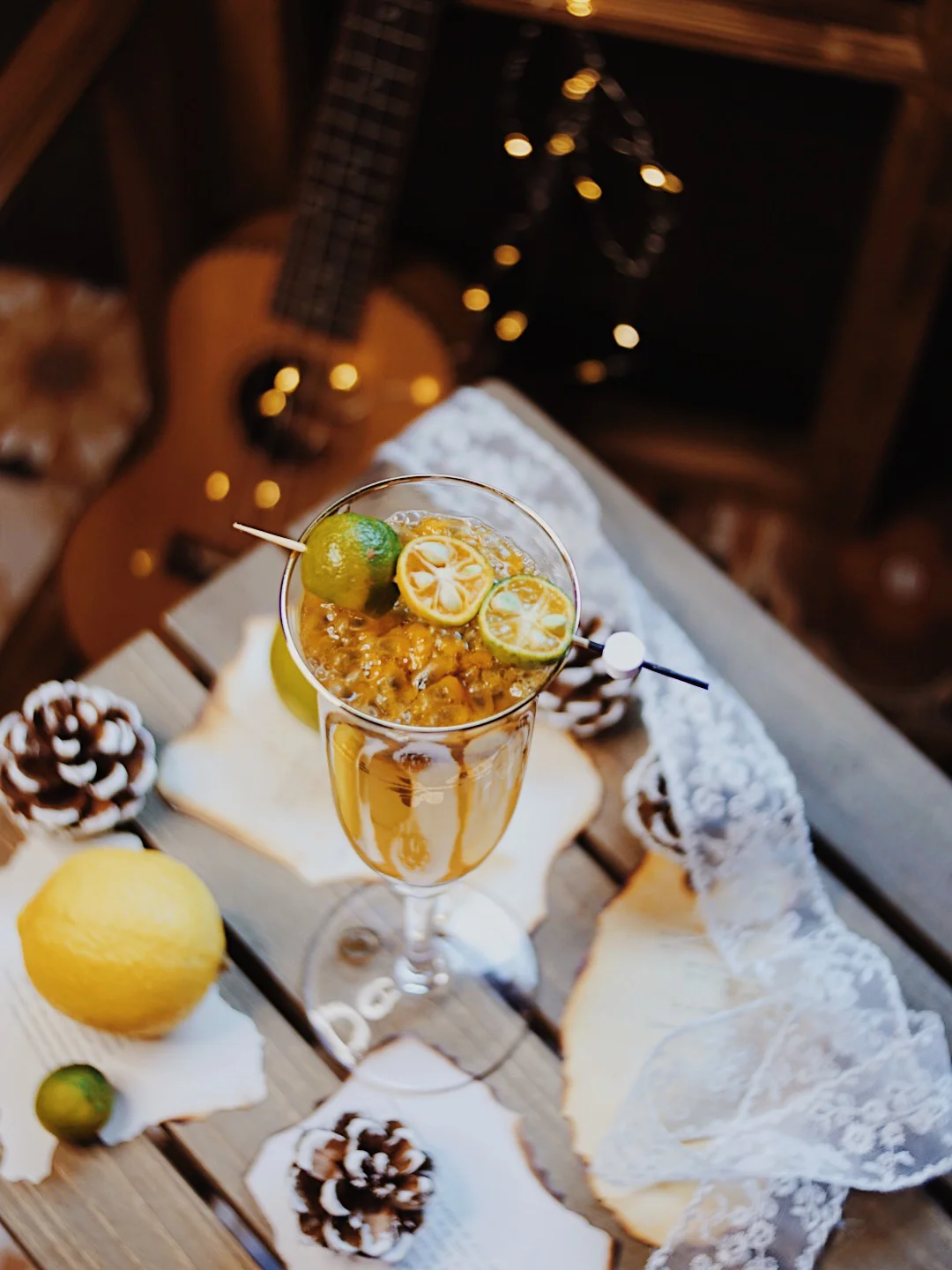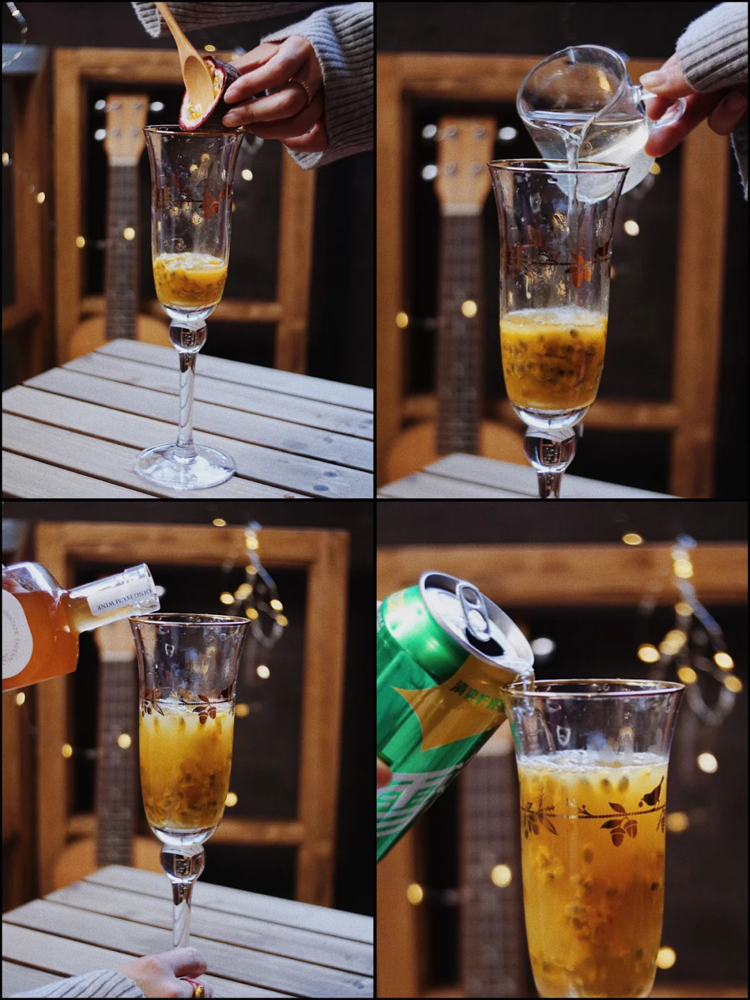 2️⃣百香果对半切开,把果肉挖入杯中,依次倒入绿茶蜂蜜水、青梅酒和雪碧