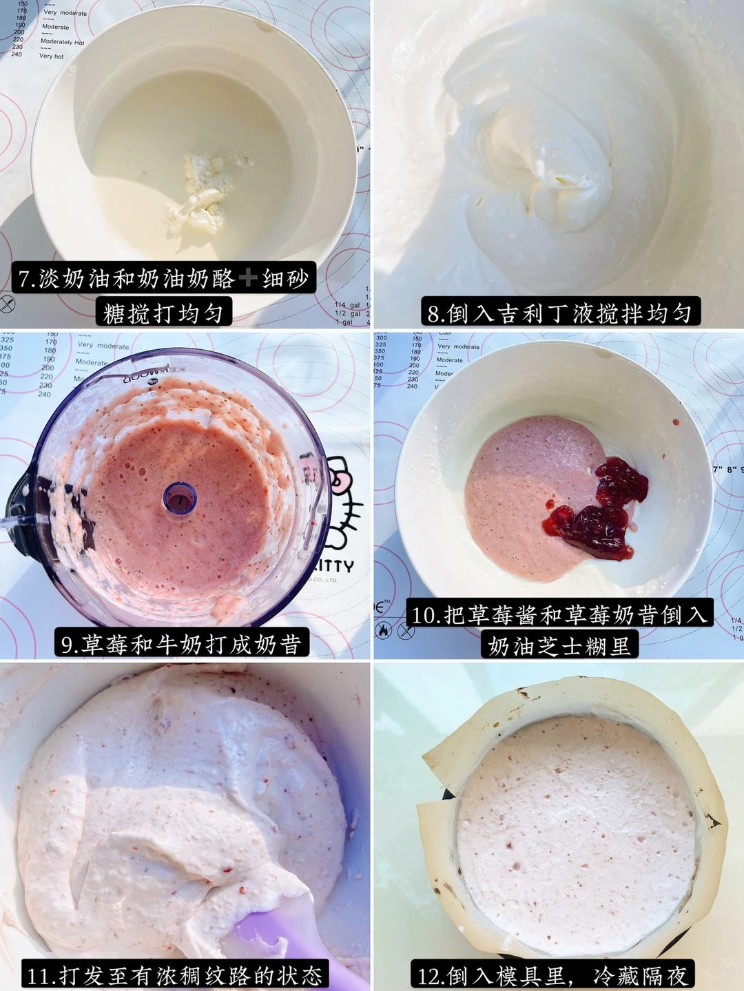 草莓慕斯一半用了草莓果酱,一半用了新鲜的草莓,所以吃起来还有草莓果肉的口感。酸甜多汁,搭配浓郁的芝士