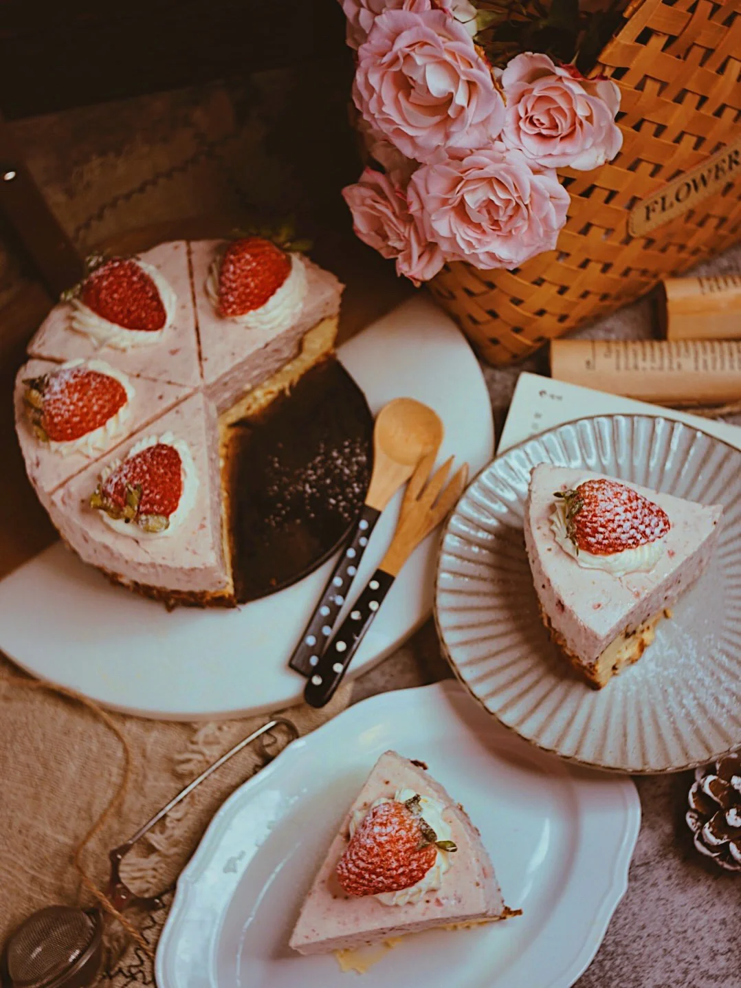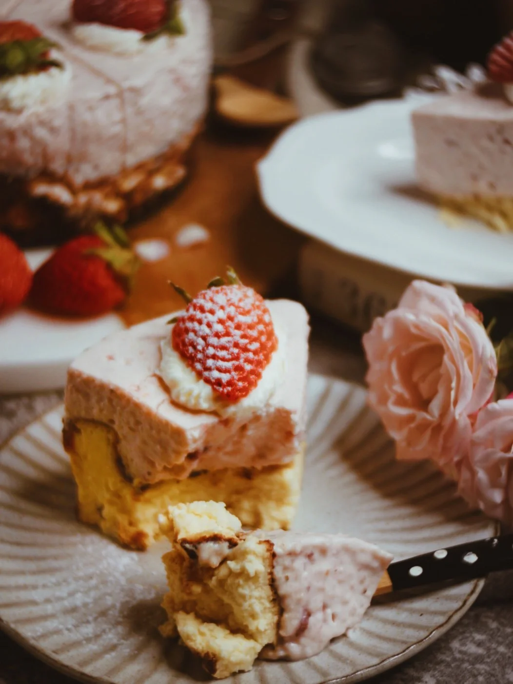 外面飘着雪花❄️给自己做了一份颜值和口感都一绝的草莓巴斯克芝士蛋糕🍰